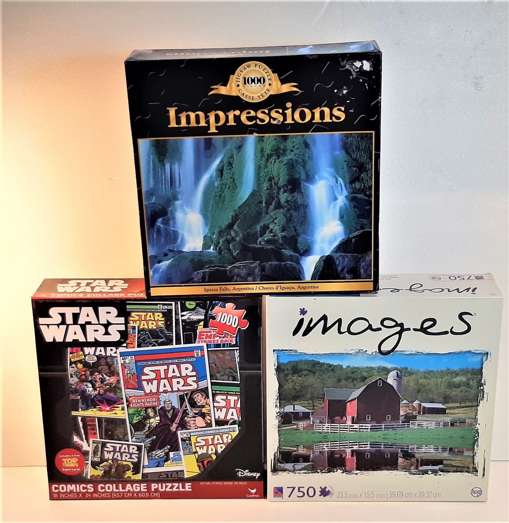 1 - 750 PC FARM PICTURE BY A LAKE, 2 - 1000 PCE STAR WARS COMIC BOOK COVERS, 3 - 1000 PCE PICTURE OF IGUAZA FALLS IN ARGENTINA. TOYS