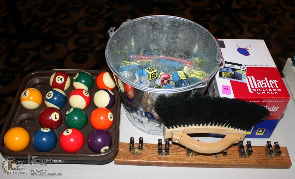 2 NEW BOXES OF BILLIARD CHALK, WITH BALLS AND MORE