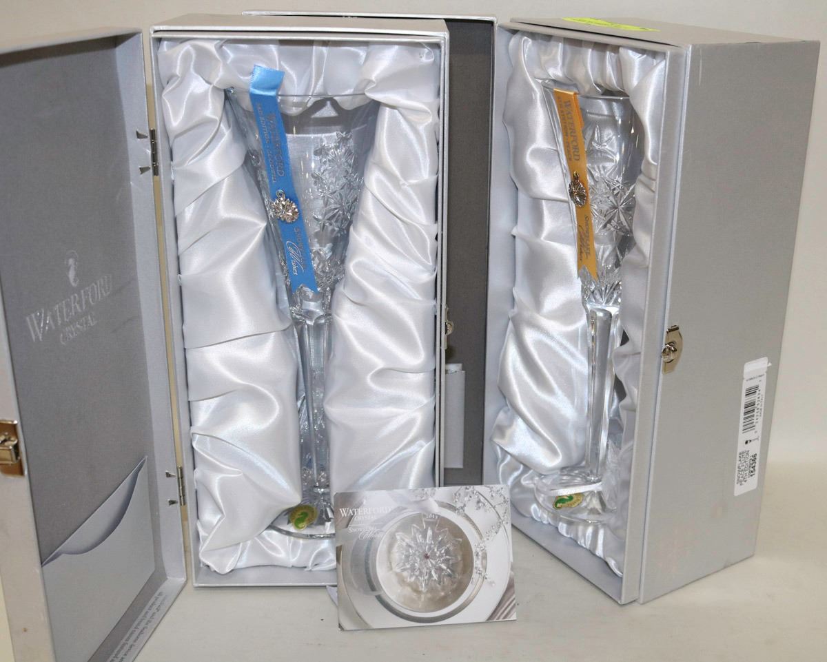3RD & 4TH EDITIONS. BOTH WITH ORIGINAL WATERFORD SATIN LINED BOX, STICKER LABEL, PAPERWORK. CRYSTAL CHAMPAGNE FLUTES ARE CUT WITH A SNOWFLAKE PATTERN. (EACH IS 10.2"H)