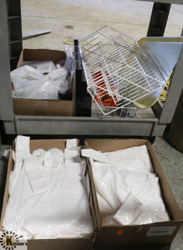 EXTRA FIXTURE PARTS & BOX OF GARBAGE BAGS, LIGHTBULBS, ETC.