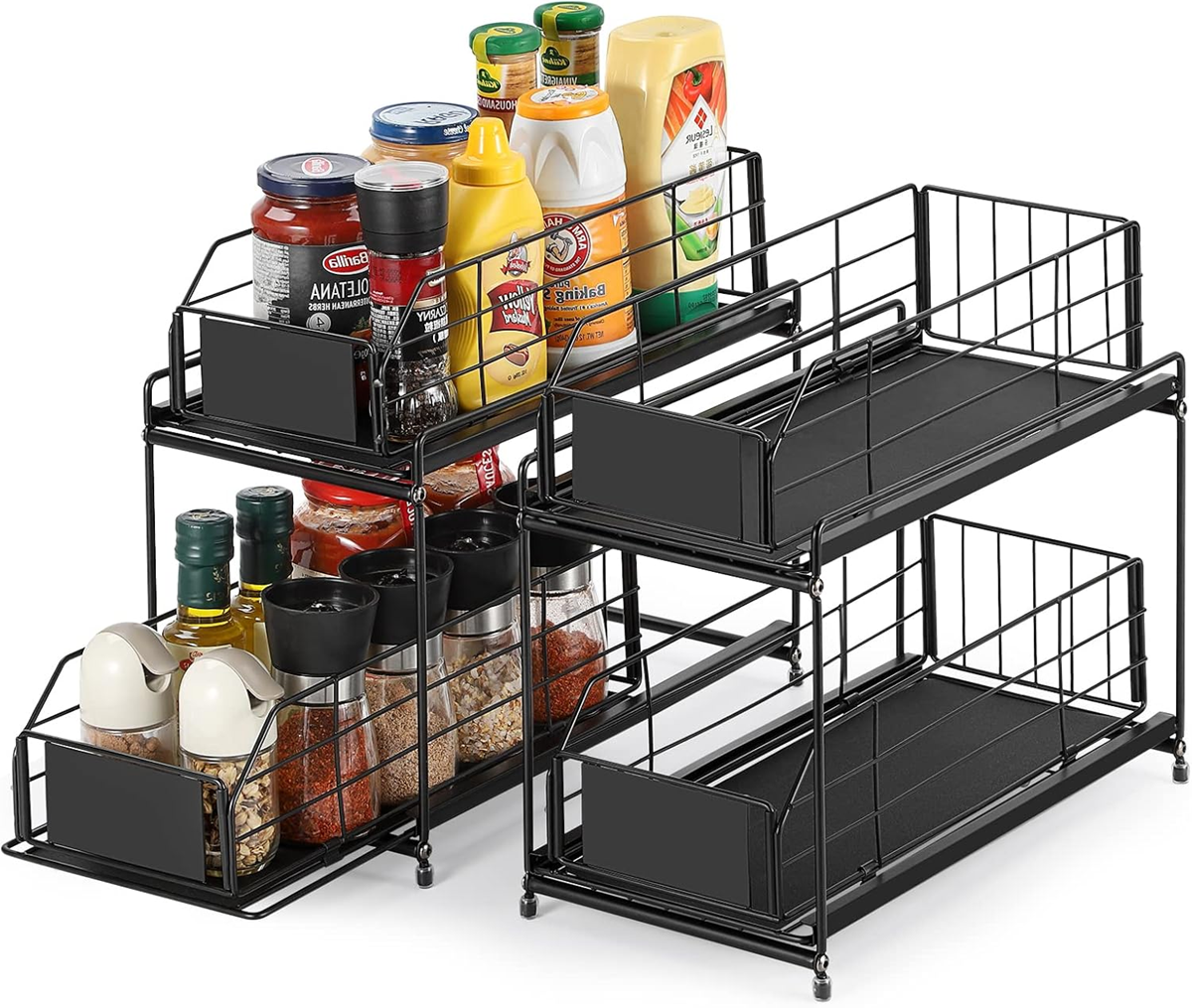 2 PACK - 2-TIER UNDER SINK CABINET ORGANIZER WITH SLIDING STORAGE DRAWER, SPICE RACK