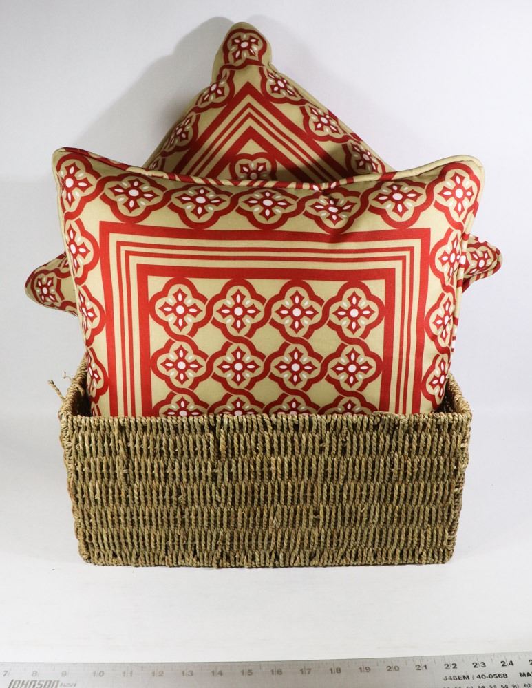 2 RED ACCENT PILLOWS IN WICKER RATTAN BASKET
