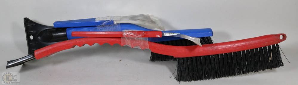 2 RED AND BLUE ICE SCRAPERS WITH HAND SCRAPERS