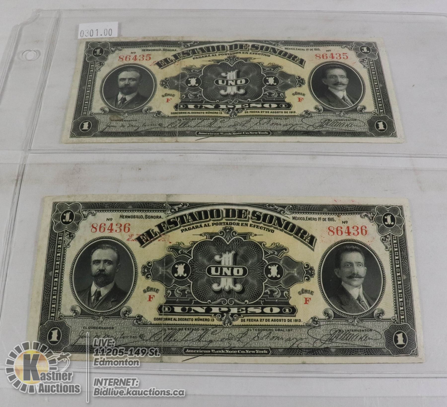 LOT OF 2 SEQUENTIAL SERIAL NUMBER BANKNOTES FROM SONORA MEXICO 1913 ISSUE BANKNOTES.