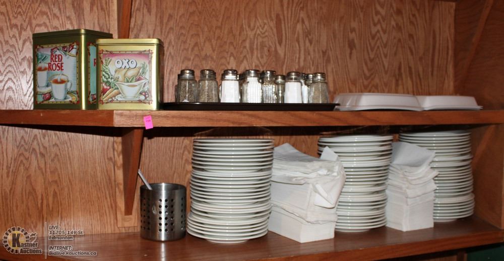 2 SHELVES OF WHITE SERVING PLATES AND MORE