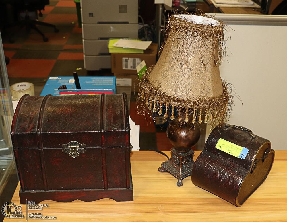 2 SMALL CHESTS AND A LAMP W/ BEADED SHADE