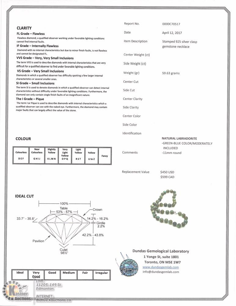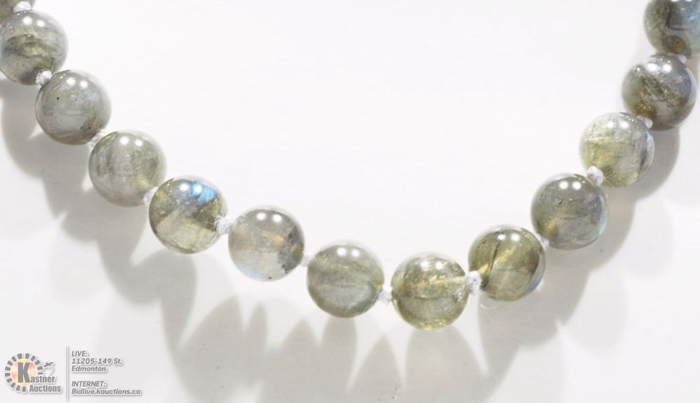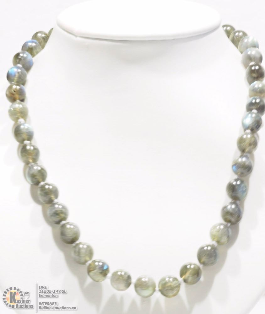 2 - MM51- STERLING SILVER LABRODITE 11MM BEAD NECKLACE (TOTAL 59.63G),W/ COA. SUGGESTED REPLACEMENT VALUE $599.00. JEWELLERY.