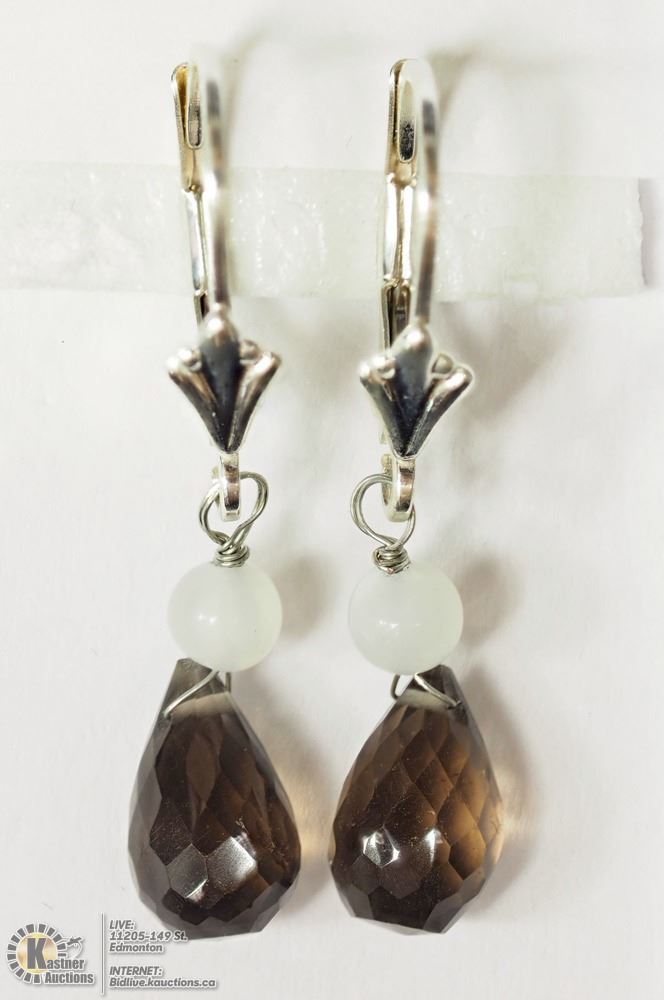 2-BA33A- STERLING SILVER SMOKEY QUARTZ DROP STYLE EARRINGS. JEWELRY.