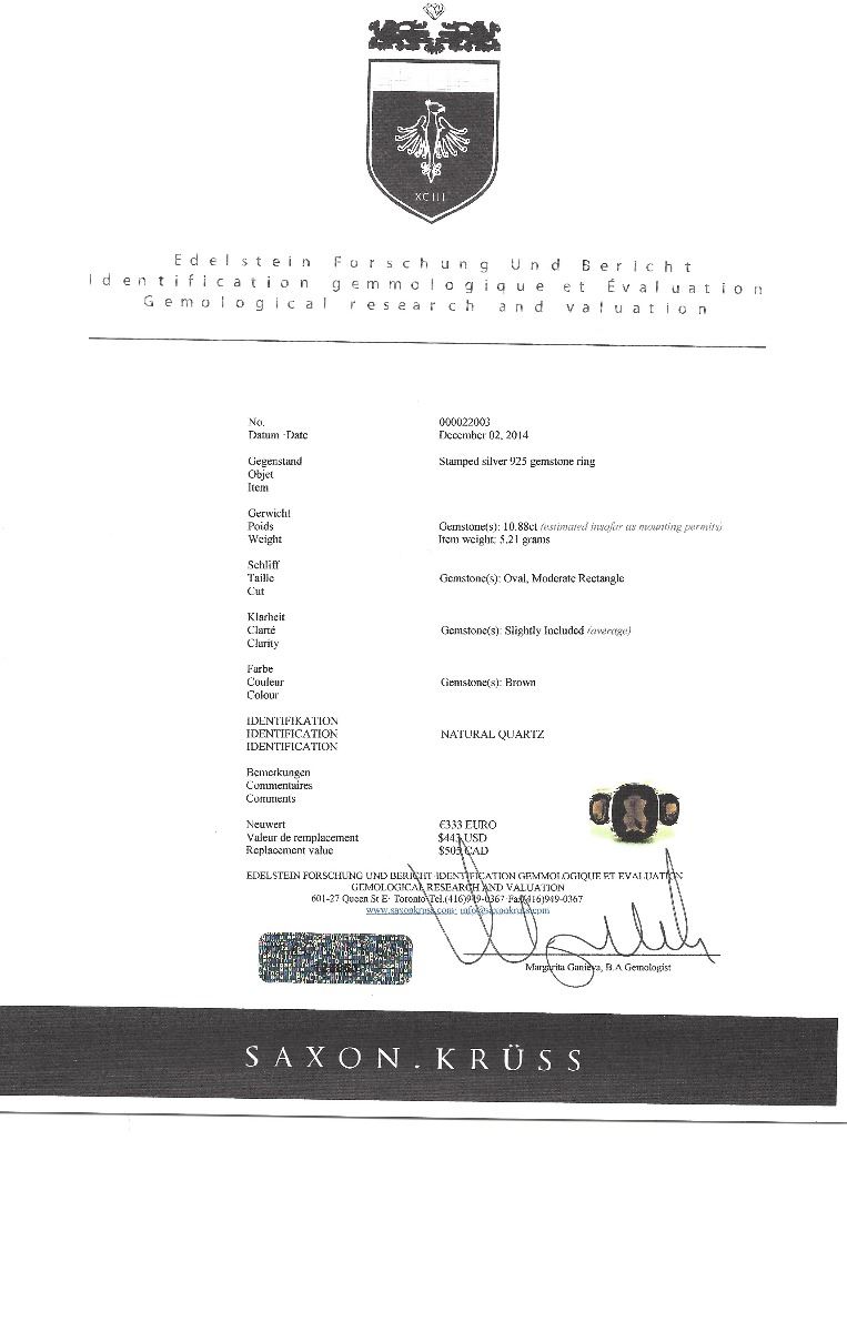 STERLING SILVER SMOKEY QUARTZ RING. W/ COA- SUGGESTED REPLACEMENT VALUE $505.00