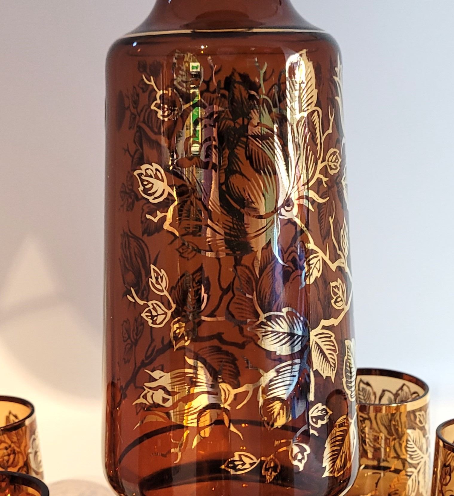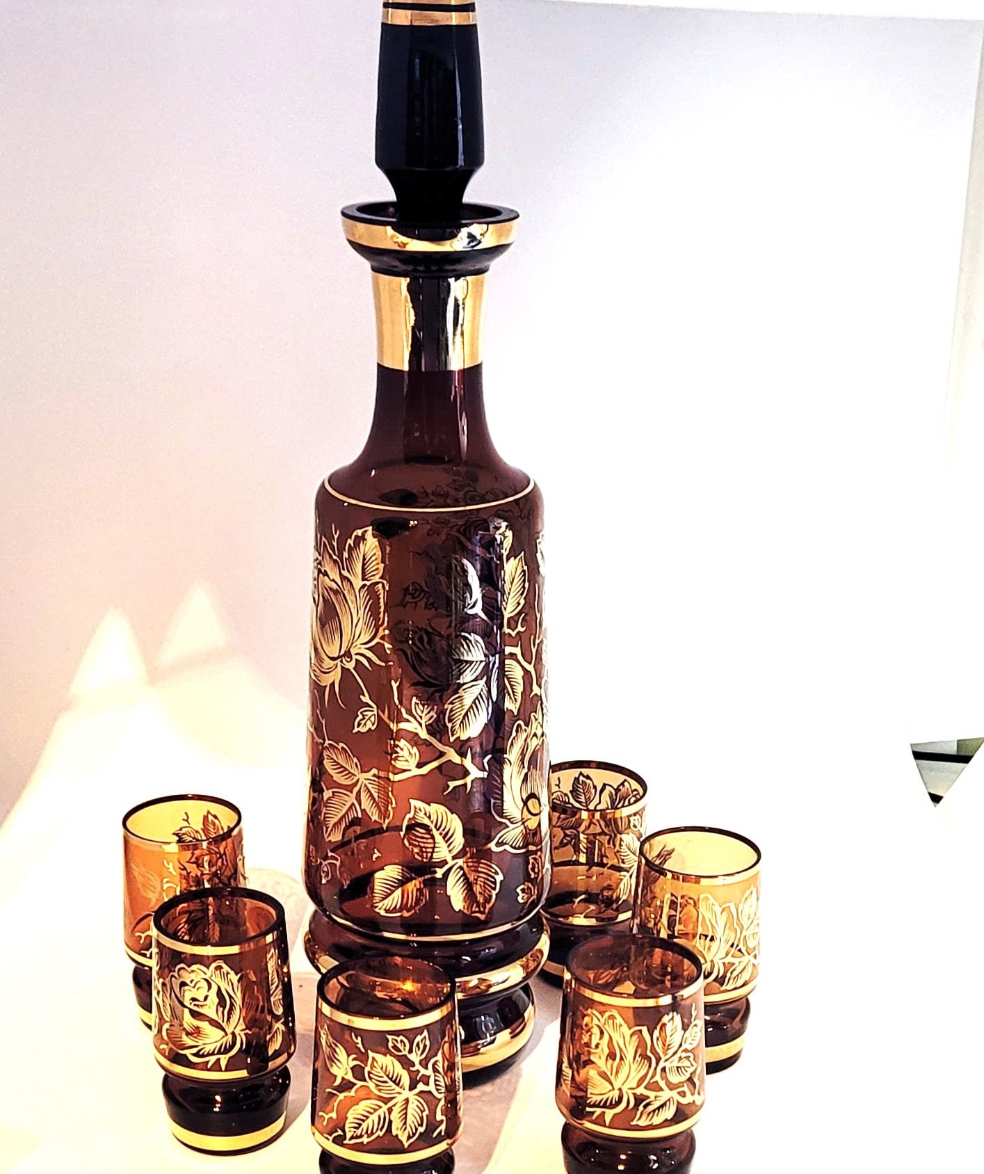 GLASS DECANTER STANDING 13.25" AND 6 SHOT STYLED GLASSES STANDING 2.5" TALL WITH A 1.25 DIAMETER . HOUSEHOLD