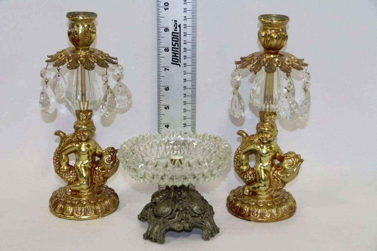 HOLDERS WITH VINTAGE BRONZE AND CRYSTAL COMPOTE CANDY DISH/ASHTRAY BRASS PEDESTAL SHABBY CHIC