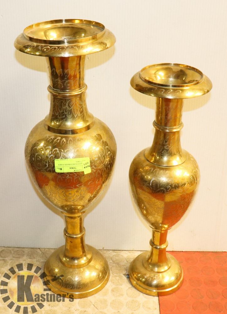 2 VINTAGE ETCHED BRASS VASES 24" & 21" TALL.