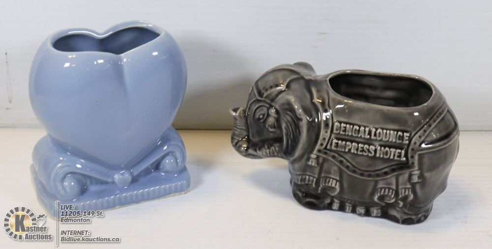 2 VINTAGE FLORAL VASES, BLUE HEART AND ELEPHANT