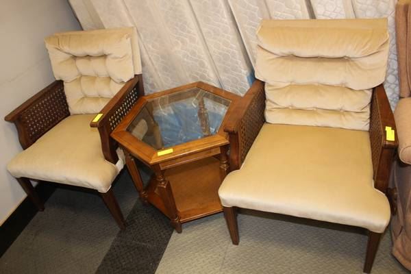 2 WOOD AND WICKER ARMCHAIRS SOLD W END TABLE