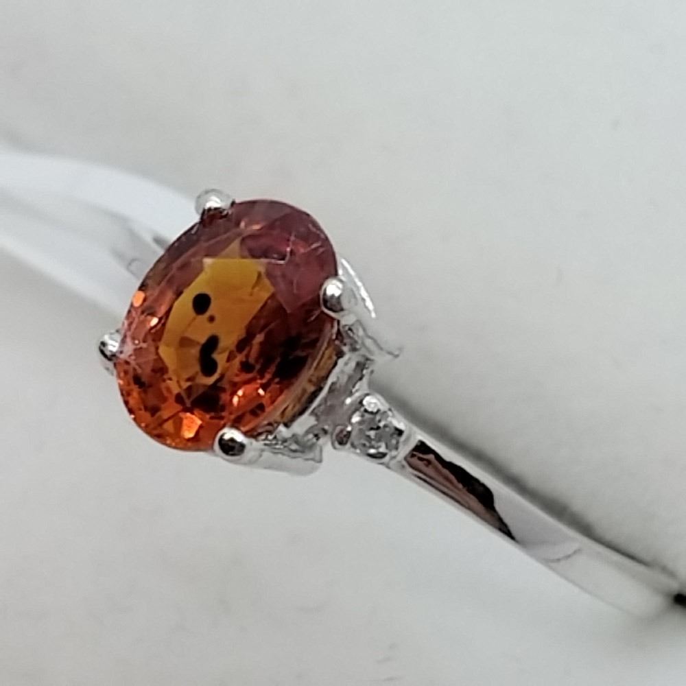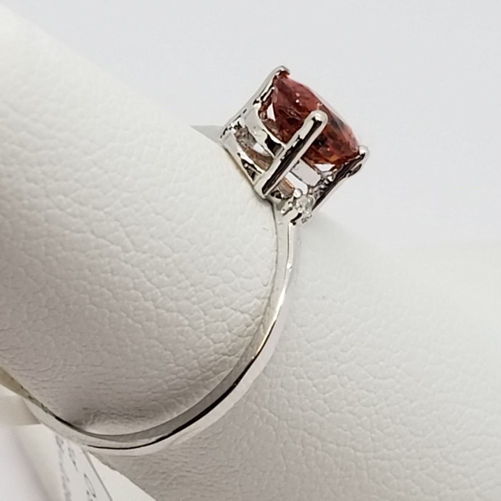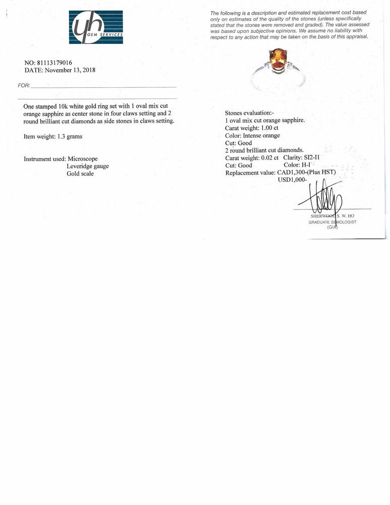 120 - JT52 - 10K WHITE GOLD ORANGE SAPPHIRE (1CTS) 2 DIAMOND (0.02CTS.) RING (SIZE 6.25) (~WEIGHT 1.3G), MADE IN CANADA W/COA, SUGGESTED REPLACEMENT VALUE $1300.00. APPRAISAL NOT FROM A LOCAL VERIFIED APPRAISER. JEWELRY