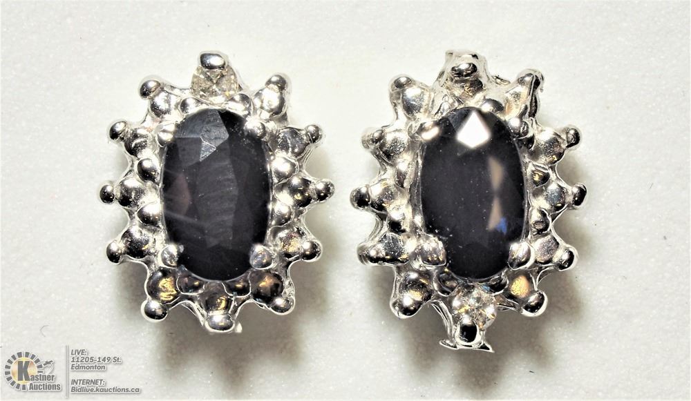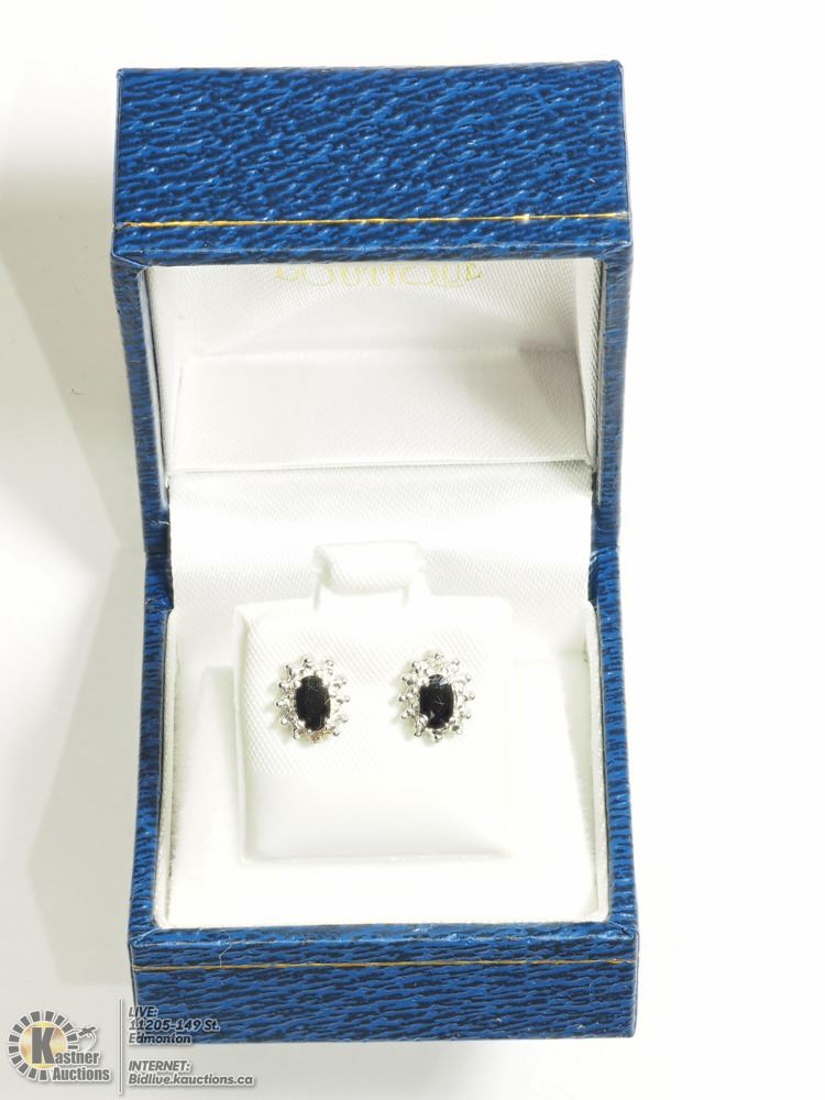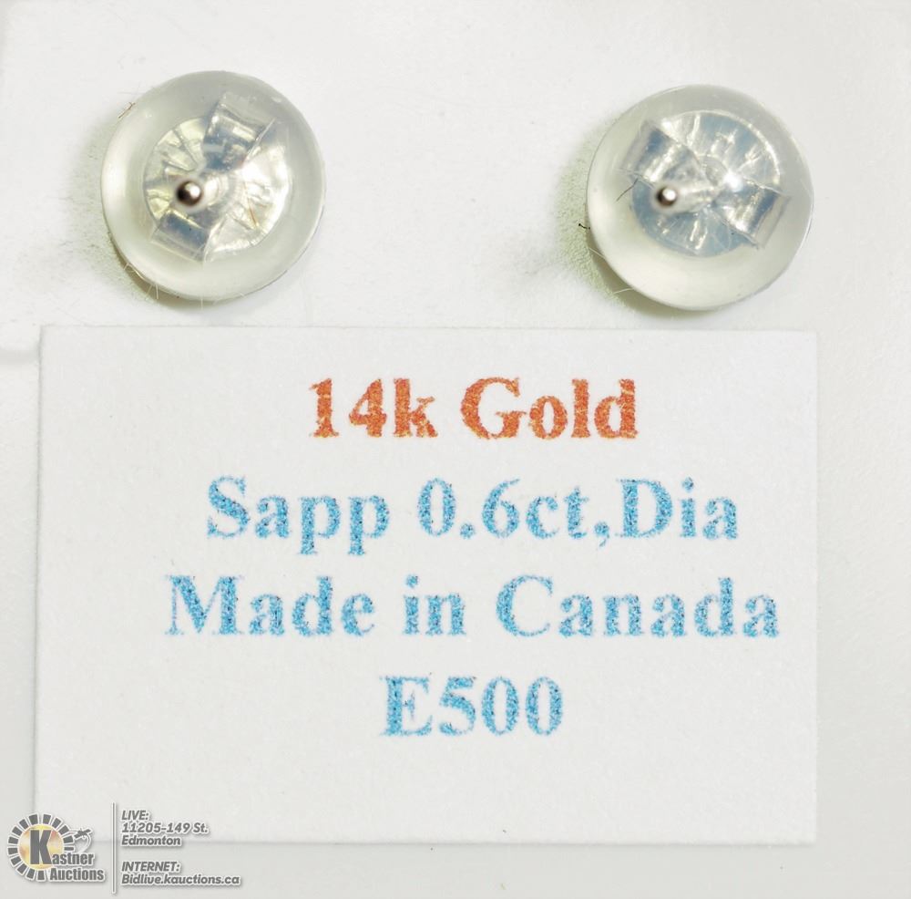 20-GC48- 14K WHITE GOLD SAPPHIRE (0.60CT) AND DIAMOND (0.01CT) HALO EARRINGS W/COA. SUGGESTED REPLACEMENT VALUE $1200.00. JEWELLERY.