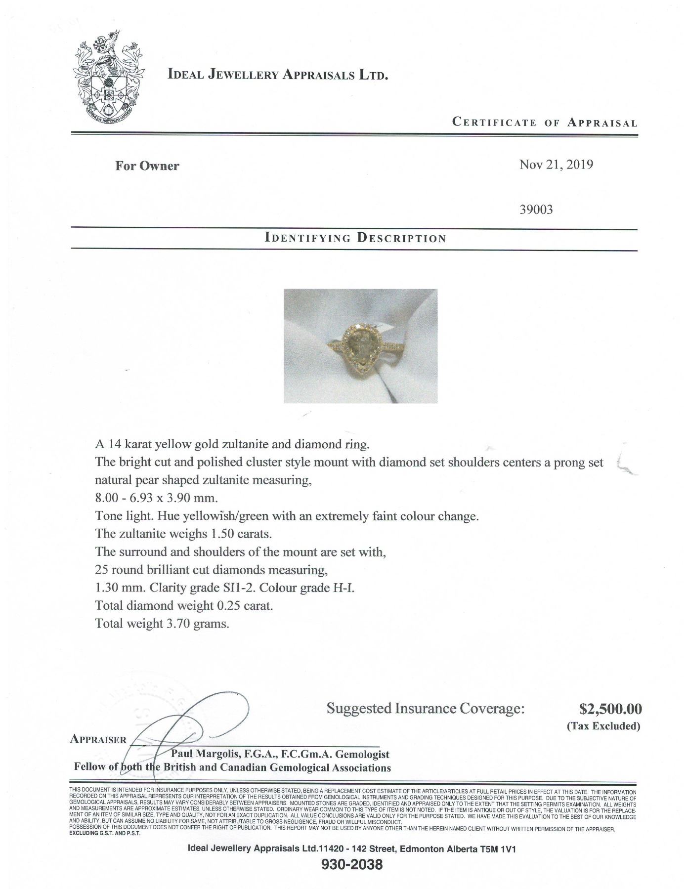 SIZE 6WITH LOCAL APPRAISAL, ZULTANITE CARAT WEIGHT 1.50 CARATS, 25 ROUND BRILLIANT CUT DIAMONDS, CALRITY GRADE SI 1-2, COLOR GRADE H-I, DIAMOND WEIGHT 0.25 CARATS, TOTAL WEIGHT 3.70 GRAMS. SUGGESTED INSURANCE COVERAGE $2,500.00. JEWELLERY