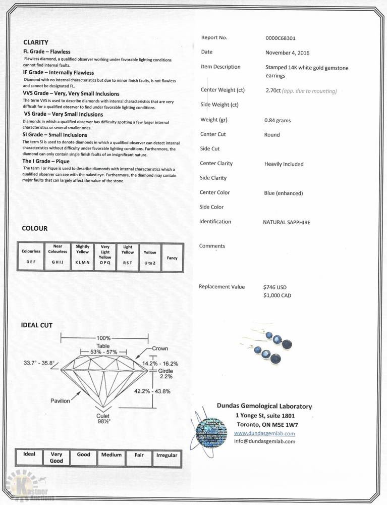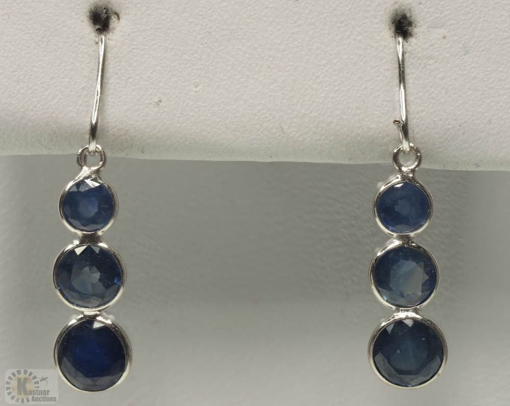 14KT WHITE GOLD SAPPHIRE(2.70CT) EARRINGS W/ COA - SUGGESTED REPLACEMENT VALUE $1,000.00