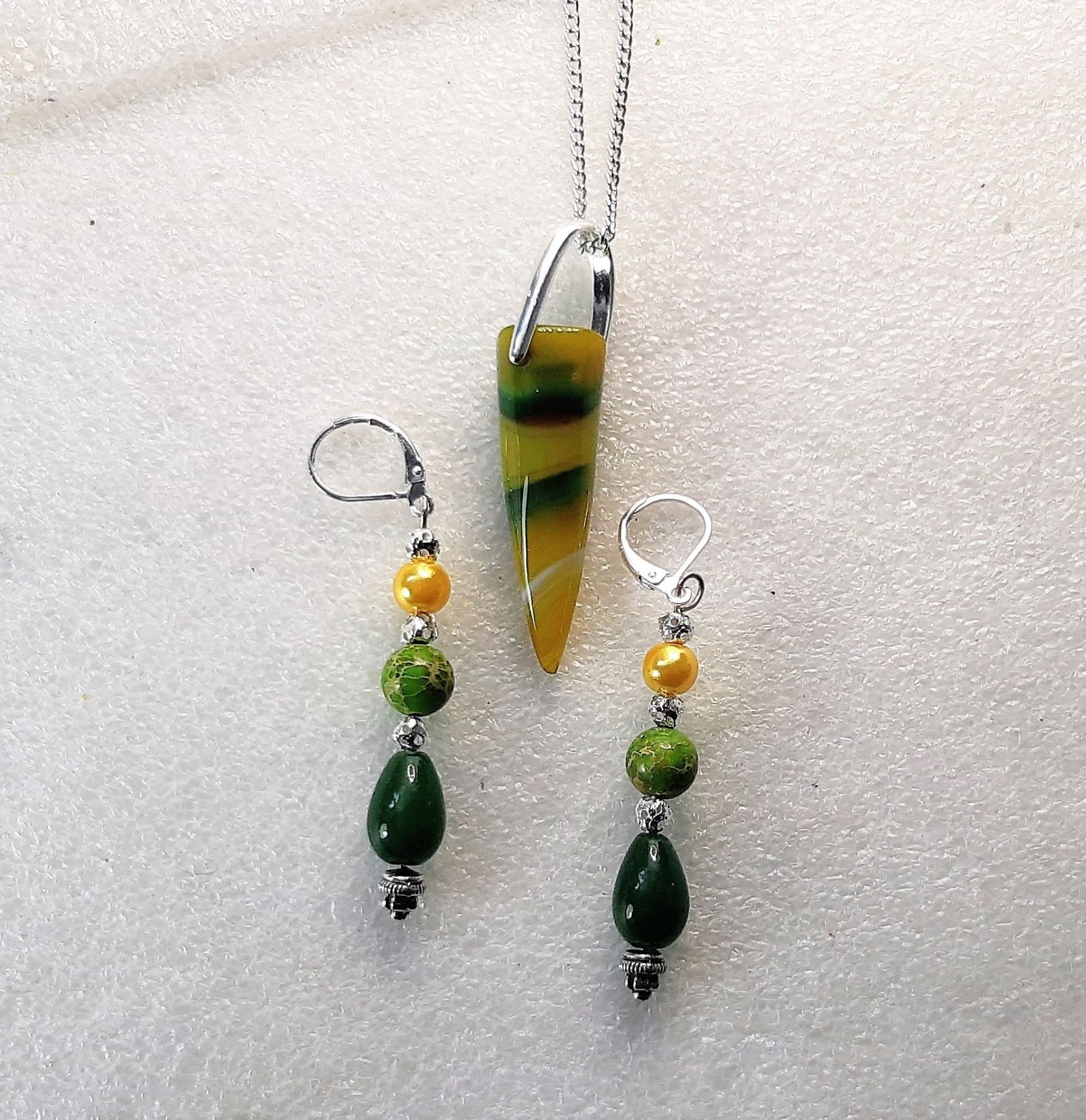 JASPER PENDANT, 2.25" IN LENGTH FROM TOP OF BALE TO TIP OF STONE ON A 20" SILVER TONE CHAIN, AND COORDINATED GREEN JADE, SEA SEDIMENT JASPER AND YELLOW FRESH WASTER PEARLS ON 925 STAMPED SILVER LEVER BACKS. JEWELRY