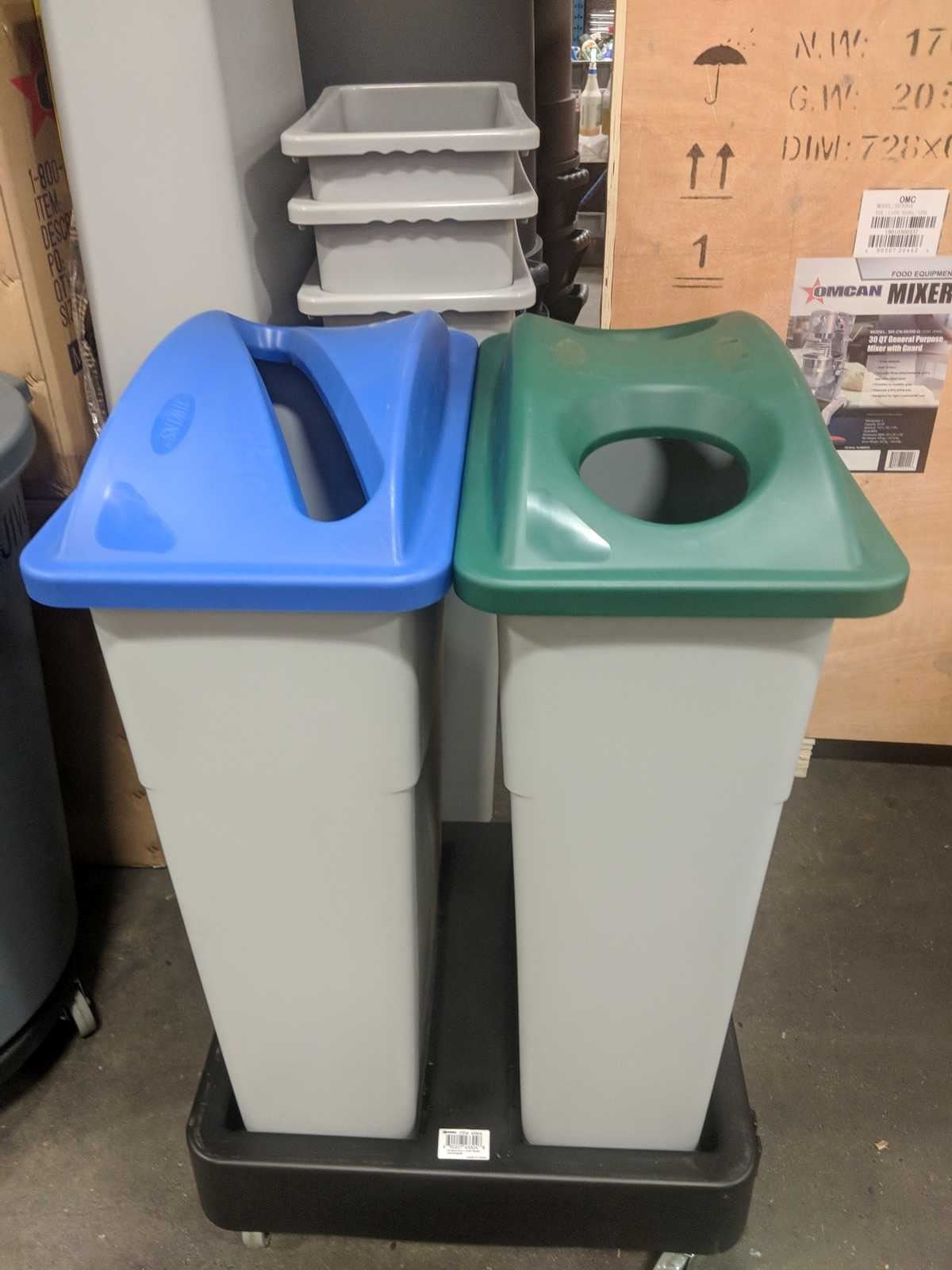 K103 NEW 20 GALLON SLIM GREY RECYCLING BINS (X2 OMCAN 43299) WITH BLUE LID (OMCAN 43300) AND GREEN LID (OMCAN 43302) WITH DOUBLE DOLLY (OMCAN 43304)