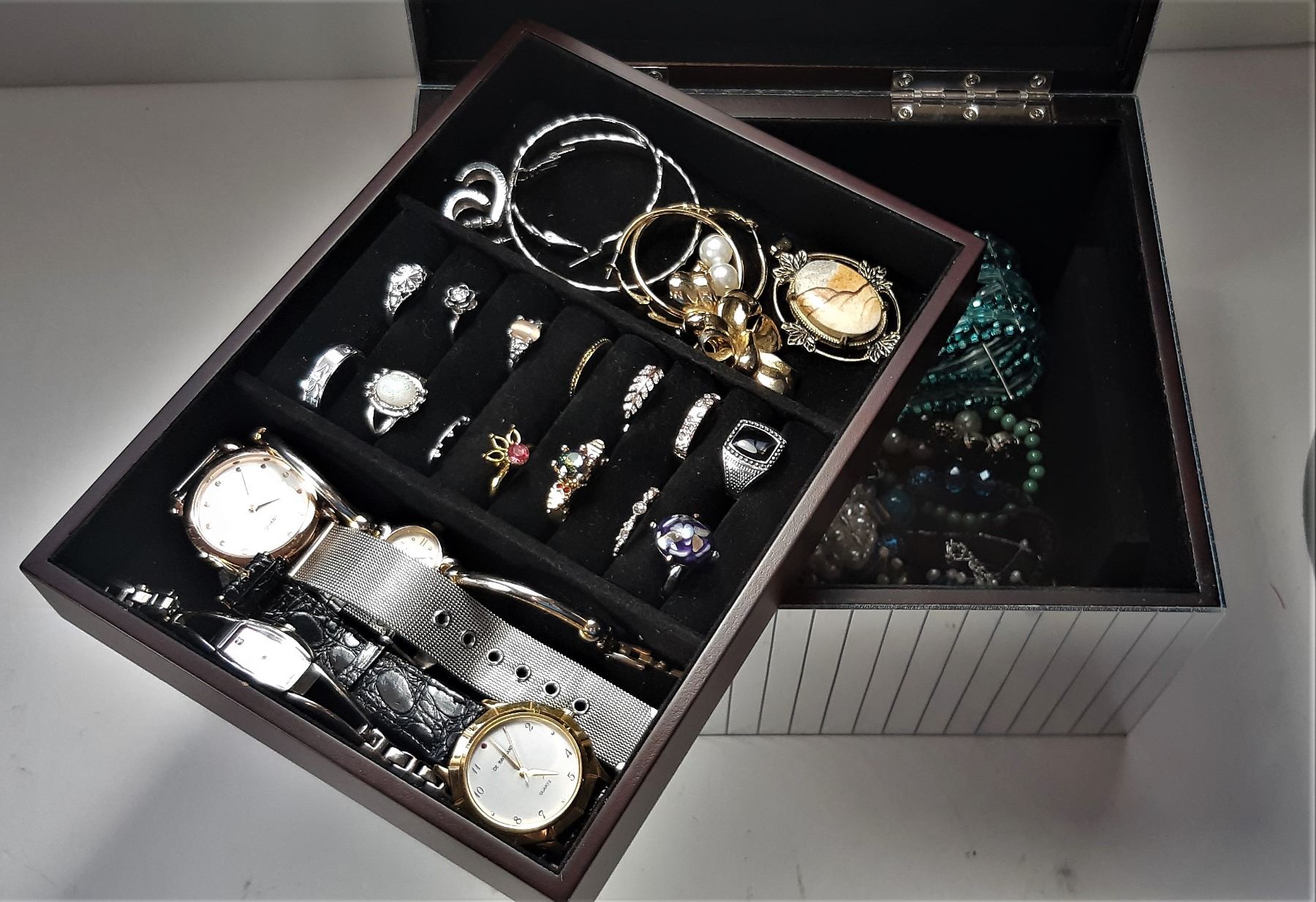INCLUDING 4 WORKING WATCHES WITH NEW BATTERIES, RINGS, EARRINGS, PENDANTS, BRACELETS AND NECKLACES. JEWELLERY