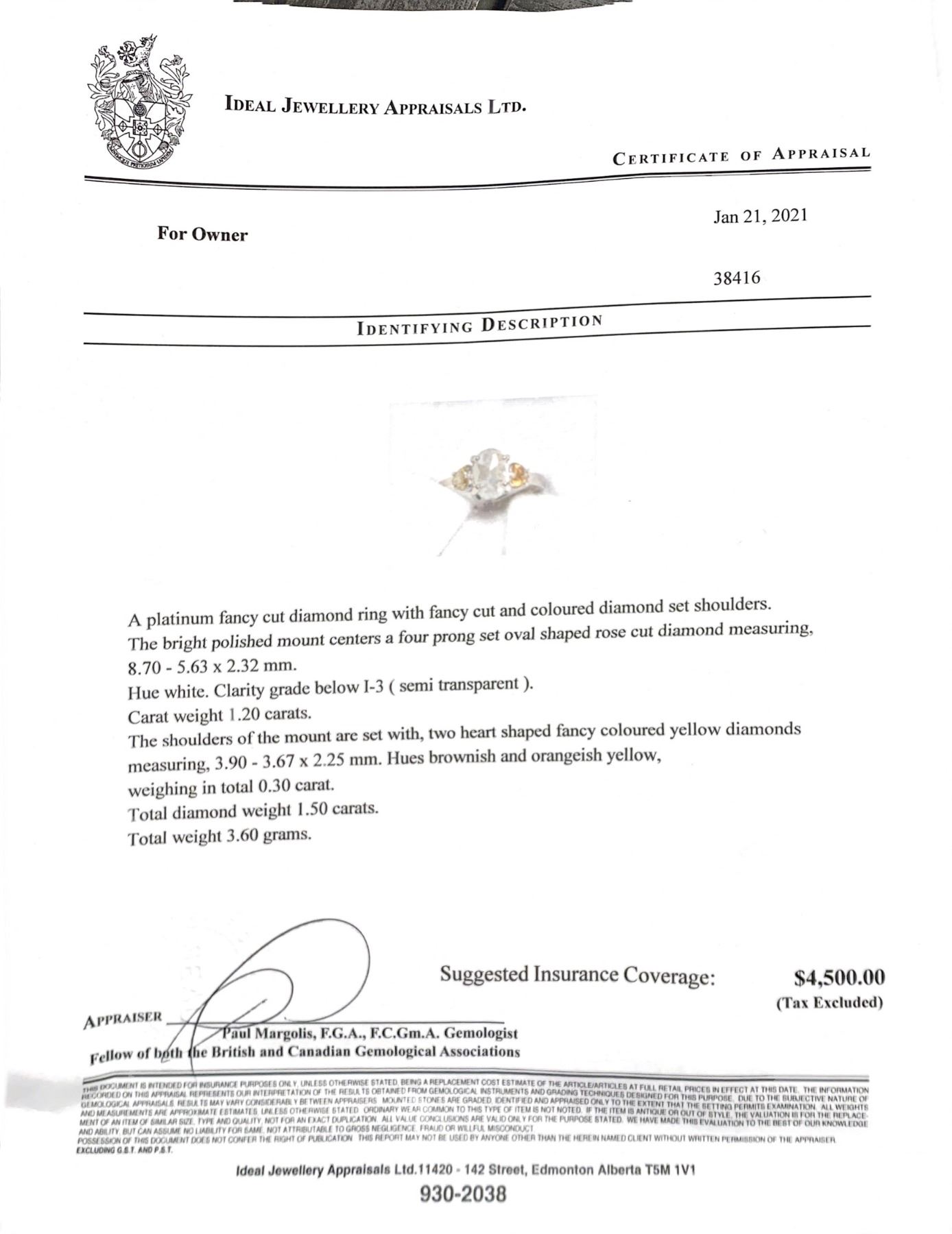 SIZE 6.5 A PLATINUM FANCY CUT DIAMOND RING WITH FANCY CUT AND COLOURED DIAMOND SET SHOULDERS. THE BRIGHT POLISHED MOUNT CENTERS A FOUR PRONG SET OVAL SHAPED ROSE CUT DIAMOND MEASURING. 8.70-5.63 X 2.32 MM HUE WHITE. CLARITY GRADE BELOW 1-3 ( SCMI TRANSPARENT ). CARAT WEIGHT 1.20 CARATS THE SHOULDERS OF THE MOUNT ARE SCT WITH, TWO HCART SHAPED FANCY COLOURED YELLOW DIAMONDS MCASARING. 3.90-367 X 225 MM. HUES BROWISH AND ORANGEISH YELLOW, WEIGHING IN TOTAL 0.30 CARAT. TOTAL DIAMOND WEIGHT 1.50 CARATS. TOTAL WEIGHT 3.60 GRAMS CERTIFICATE OF APPRAISAL FROM LOCAL APPRAISER, SUGGESTED INSURANCE COVERAGE $4500.00.