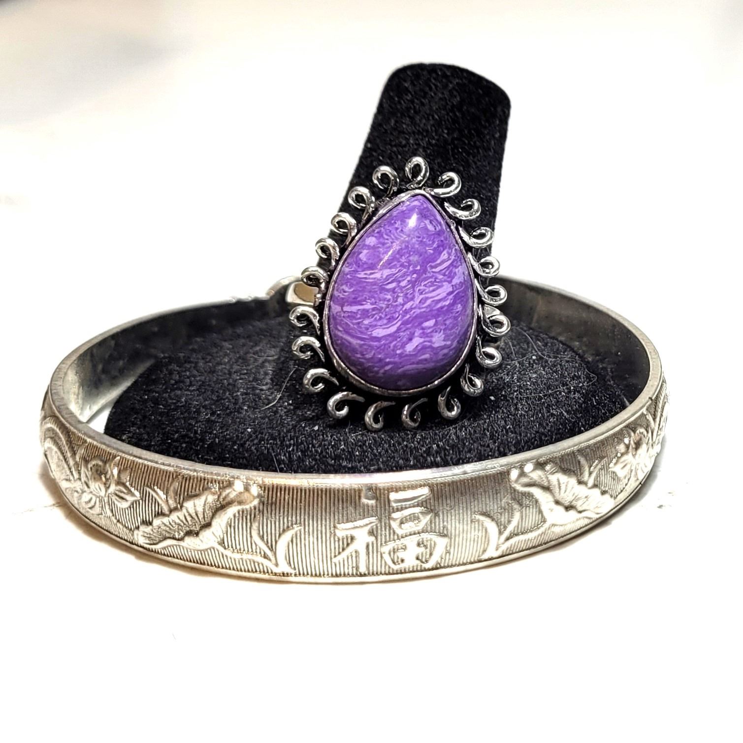 CHAROITE RING WITH OPEN TWIST SETTING (TIBETAN SILVER IN MODERN USAGE REFERS TO A VARIETY OF WHITE NON-PRECIOUS METAL ALLOYS USED PRIMARILY IN JEWELRY COMPONENTS, WITH AN APPEARANCE SIMILAR TO AGED SILVER