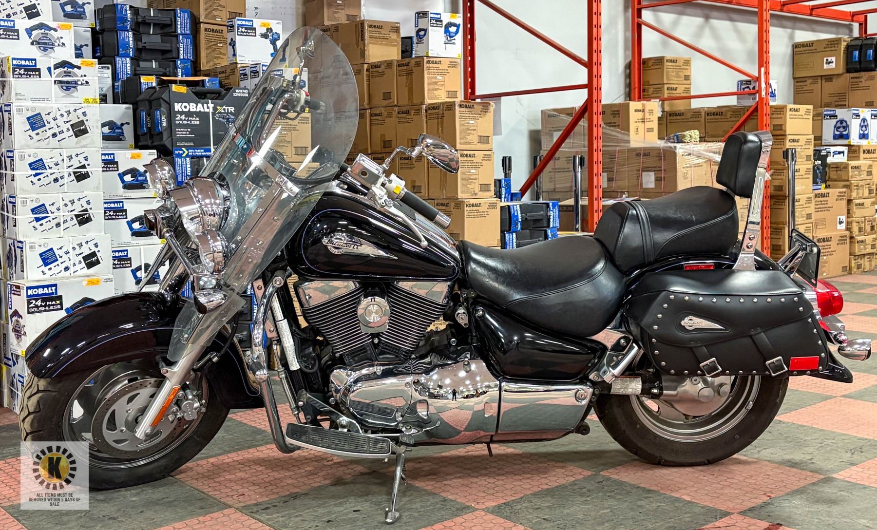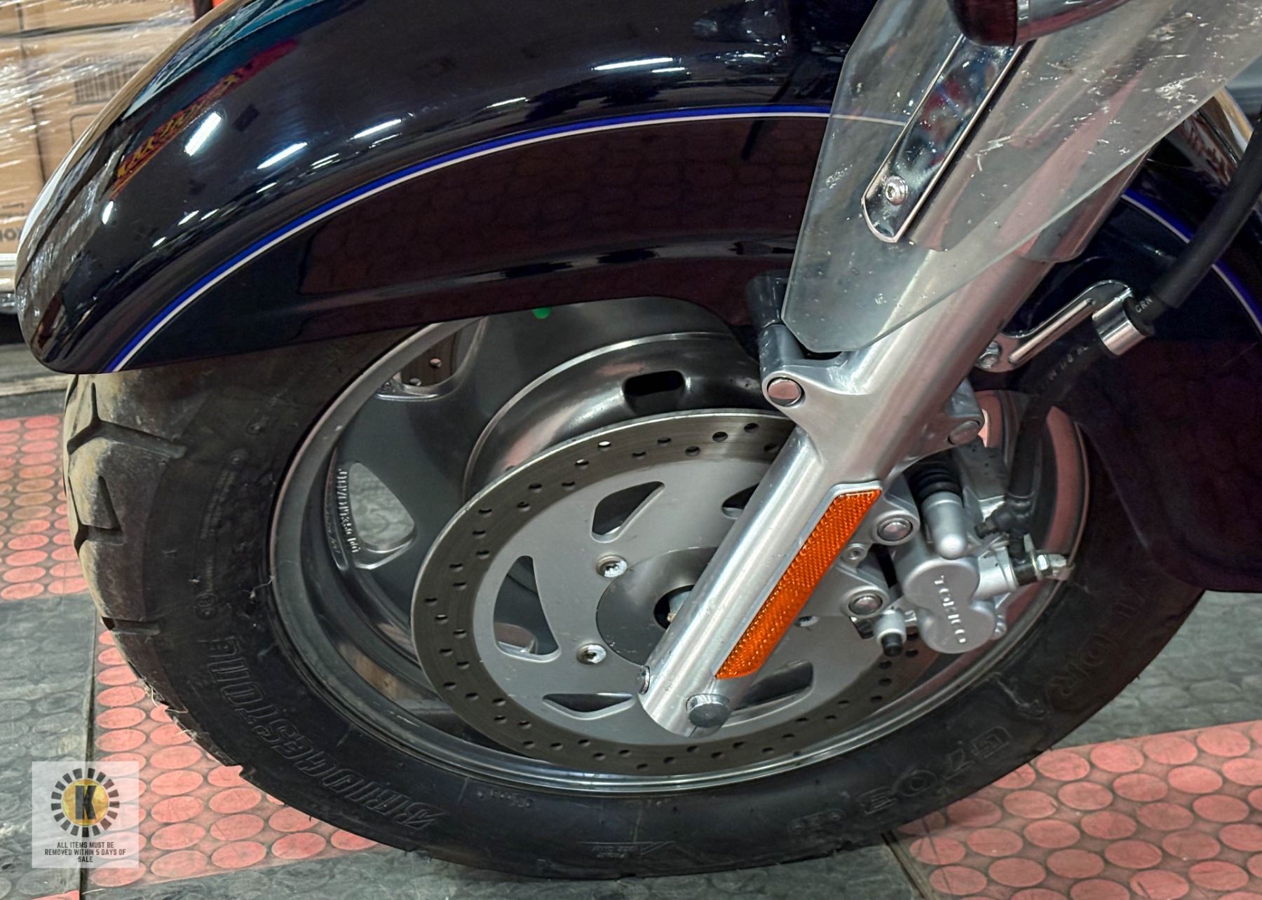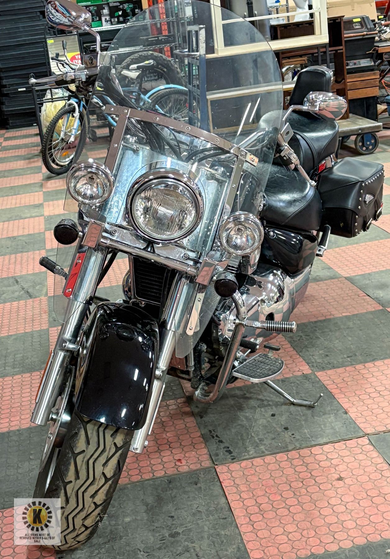 MOTORCYCLE FEATURES NORMAL ACTIVE STATUS, 1500 CC DRIVE SHAFT, MIDNIGHT BLACK METALLIC WITH SILVER/PURPLE, PIN STRIPES WITH NYLON COVER, FULL DRIVING WINDSHIELD, HIGHWAY DRIVING LIGHTS, HIGHWAY FOOT BARS/ FOOT PADS, EXTRA LARGE PADDED SEAT AND PASSENGER, BACK REST, SOFT SIDE LEATHER SADDLE, BAGS FACTORY TOOLS/MANUAL, COBRA LONG SHORT EXHAUST.