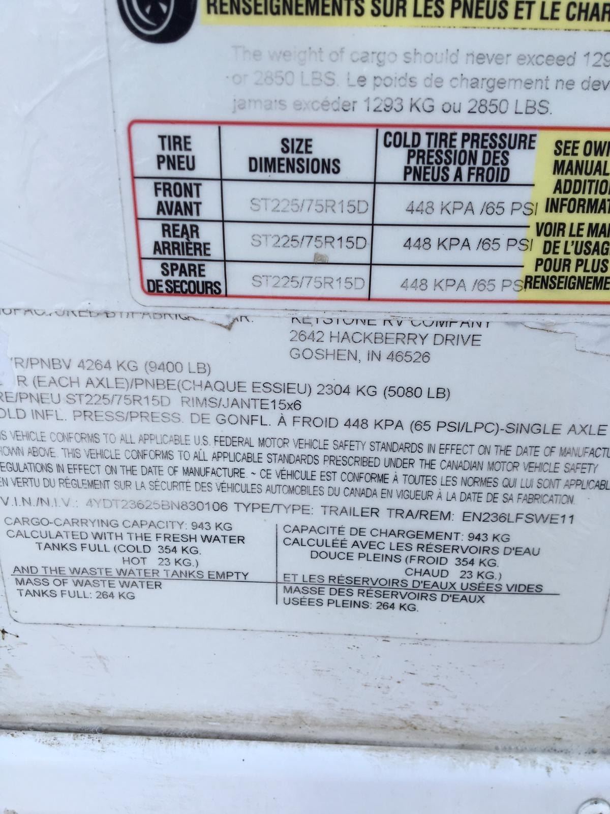 VIN: 4YDT23625BN830106 FULLY LOADED, HARD WALL, POWER REAR BUNKS, CUMMINS GENERATOR, LEATHER FLIP UP COUCHES, POWER AWNING, NEW MATTRESS, OUTDOOR STEREO, FUEL TANK ON BOARD, SALVAGE TITLE, WILL NEED OUT OF PROVINCE INSPECTION LAST REGISTERED IN BC.. NO KEYS, ALL BIDS ARE SUBJECT TO BANK BAILIFF OR OWNER APPROVAL. VEHICLE