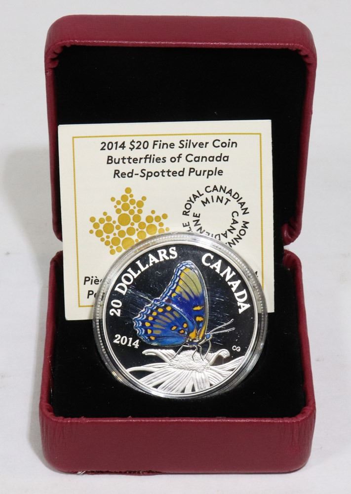 2014 FINE SILVER CANADA $20 RED SPOTTED PURPLE BUTTERFLY RCM COIN IN CAPSULE AND CASE - CURRENCY