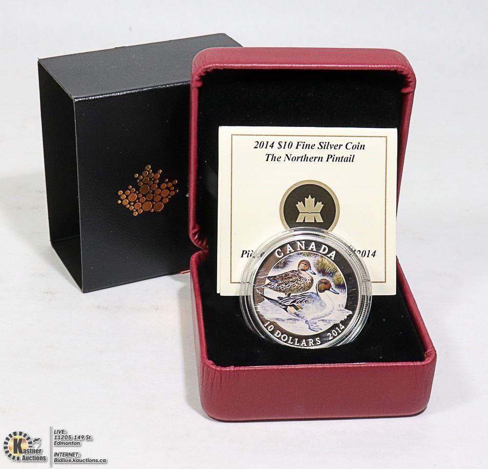 2014 SILVER NORTHERN PINTAIL DUCK $10 PROOF COIN, ROYAL CANADIAN MINT ISSUED