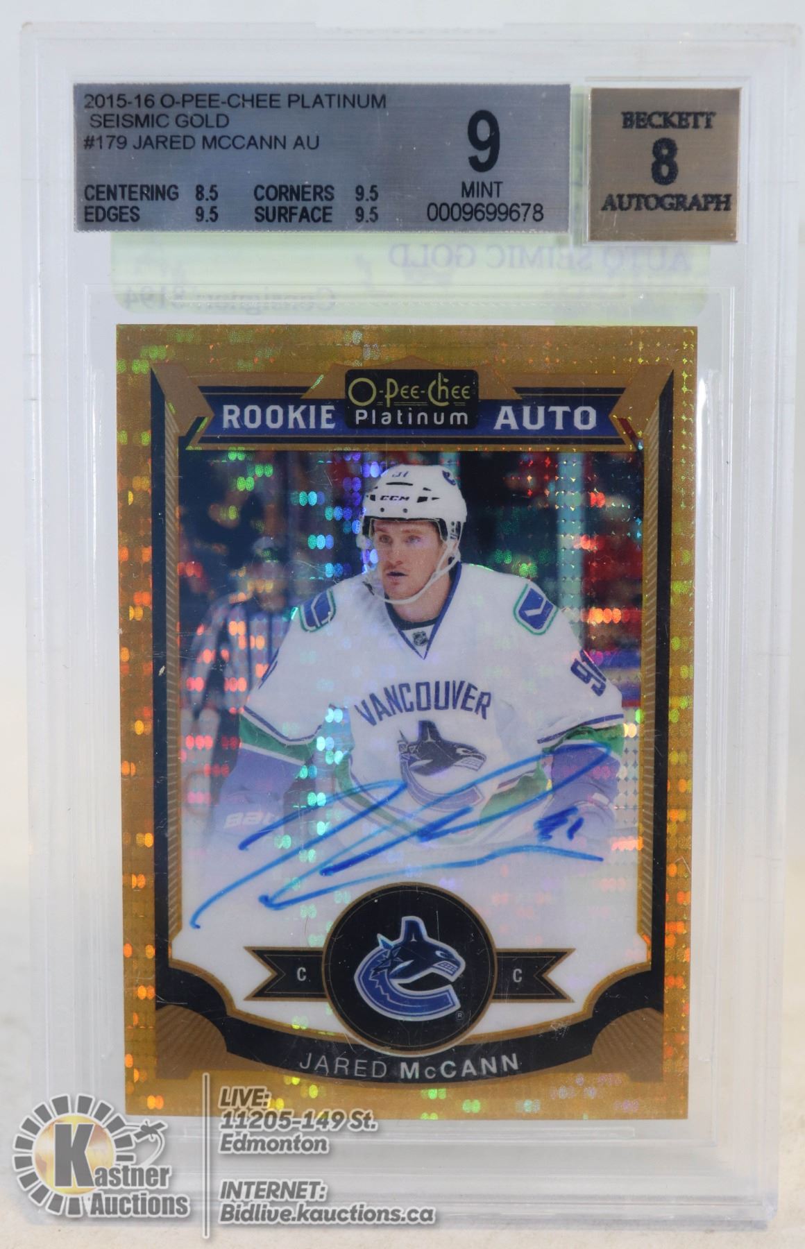 2015-16 OPC PLATINUM ROOKIE AUTO SEIMIC GOLD JARED MCCANN BECKETT GRADED 9 WITH 8 AUTO NUMBER 22 OF