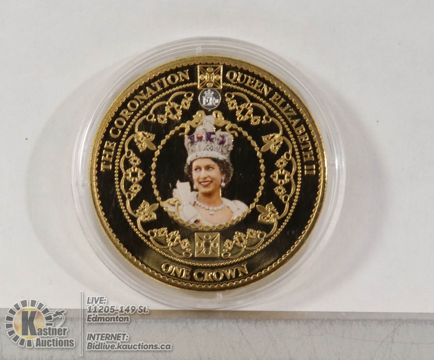 ISSUED BY TRISDAN DA CAHUNA IN 2015. GOLD PLATED 1 CROWN COIN FEATURING FAMOUS PORTRAITS OF THE QUEEN.