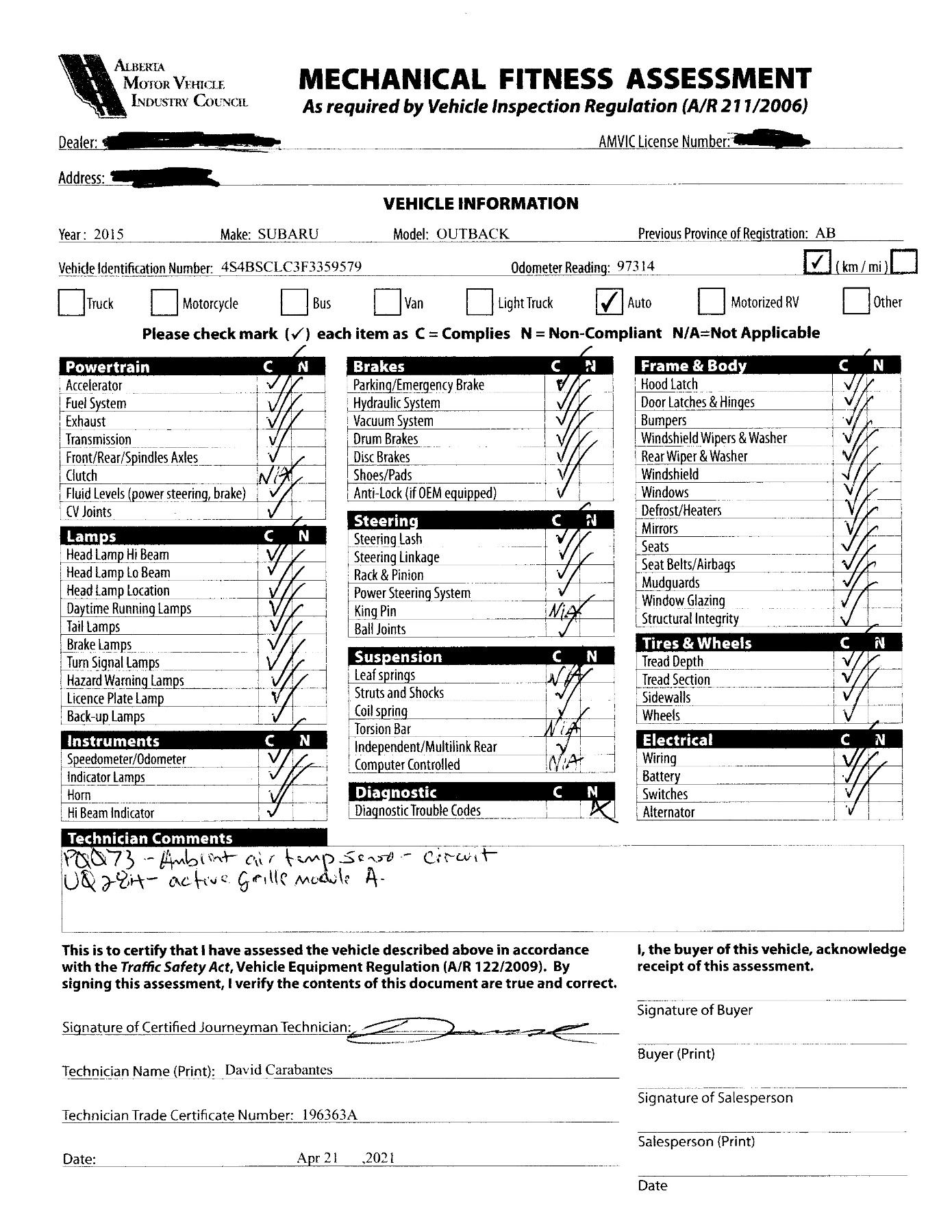 VIN: 4S4BSCLC3F3359579 KM: 97,314 Engine: 4 CYLINDER Color: WHITE, AIR CONDITIONING, CRUISE CONTROL, HEATED SEATS, POWER LOCKS, POWER WINDOWS, POWER REMOTE REAR LIFTGATE, SUNROOF, AUTOMATIC, NAVIGATION, LEATHER SEATS, ALL WHEEL DRIVE. *REBUILT STATUS* MECHANICAL FITNESS ASSESSMENT PROVIDED. ALL BIDS SUBJECT TO BANK, BAILIFF, OR OWNER APPROVAL. HIGH BIDDER WILL BE CONTACTED BY THE AUCTION HOUSE TUESDAY MORNING.***ITEM(S) LOCATED IN LETHBRIDGE ALBERTA