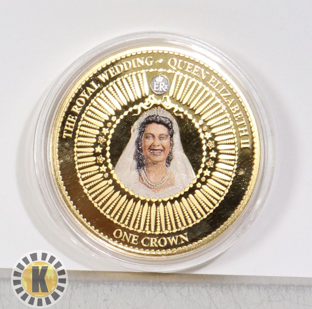 PORTRAITS OF THE QUEEN SERIES. COLOURIZED PROOF 1 CROWN COIN FROM TRISDAN DA CAHUNA. GOLD PLATED FINISH WITH MARRIAGE PORTRAIT REVERSE ***ITEM LOCATED IN LETHBRIDGE AB