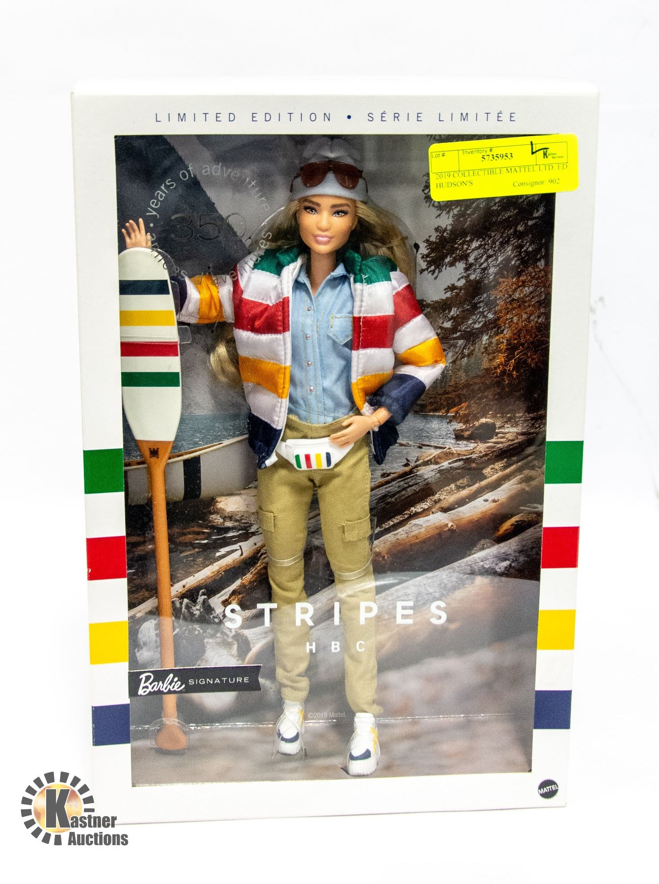BAY CO. 350TH ANNIVERSARY TRIPES BARBIE SIGNATURE - WEARING: VERSATILE PUFFER JACKET, BELT BAG, MATCHING HIKING BOOTS AND PADDLE BEARING THE ICONIC STRIPES - ONLY 20,000 WORLDWIDE - NEW IN ORIGINAL BOX (MSRP-$175 @ HUDSON'S BAY) **ALL ITEMS MUST BE REMOVED BY 5PM SATURDAY, DECEMBER 9TH 2023. ALL REMAINING ITEMS WILL BE SUBJECT TO A $6.00 PER DAY STORAGE CHARGE. ANY ITEMS REMAINING AFTER THURSDAY, DECEMBER 21ST 2023 WILL BE CONSIDERED FORFEITED. NO REFUNDS WILL BE ISSUED FOR FORFEITED ITEMS. TO SCHEDULE A PICK UP APPOINTMENT CLICK HERE