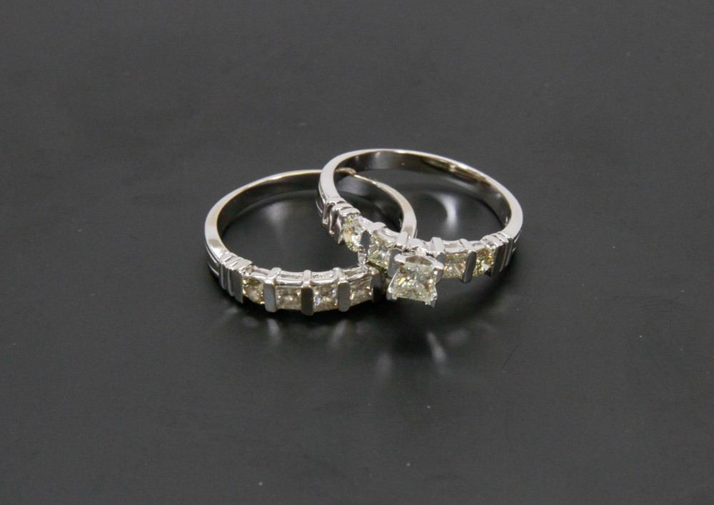 - RING SET HAS 1 PRINCESS CUT DIAMOND (.34CT) 4 TOTAL ROUND FULL CUT DIAMOND MELEE BETWEEN THE ENGAGEMENT & BAND (.48 TOTAL CT) AND 4 TOTAL PRINCESS CUT DIAMOND MELEE BETWEEN BOTH RINGS (.60 TOTAL CT), RING SIZE 8.5. APPRAISAL FROM LOCAL APPRAISER, APPROXIMATE REPLACEMENT VALUE $3800.00+GST. JEWELLERY
