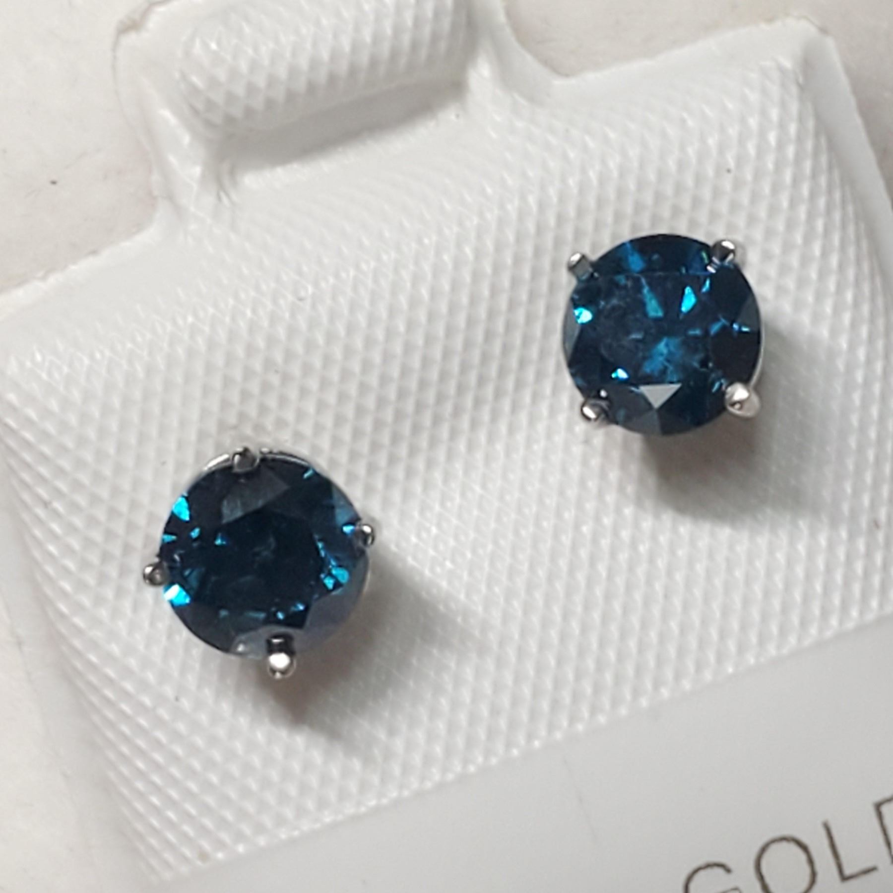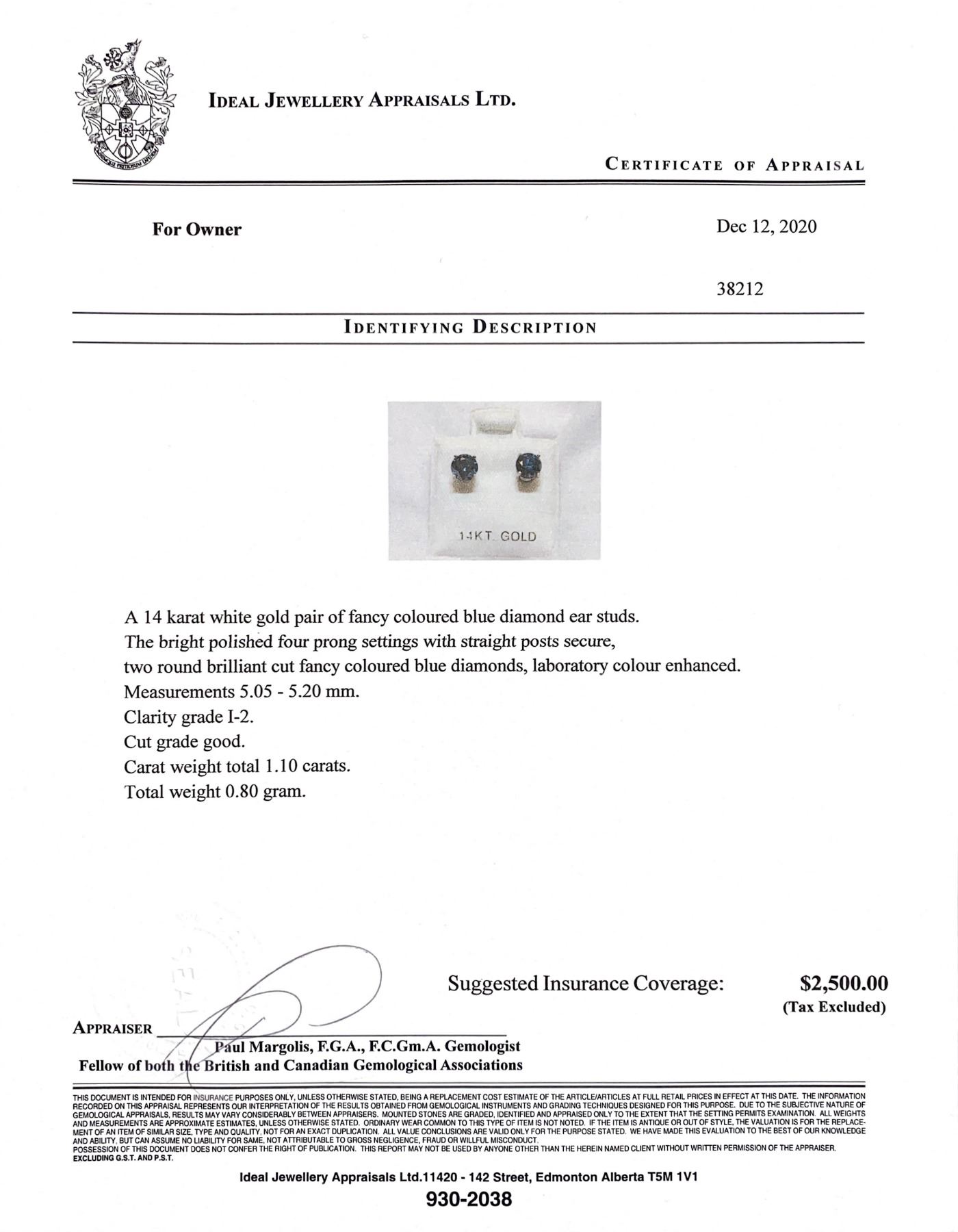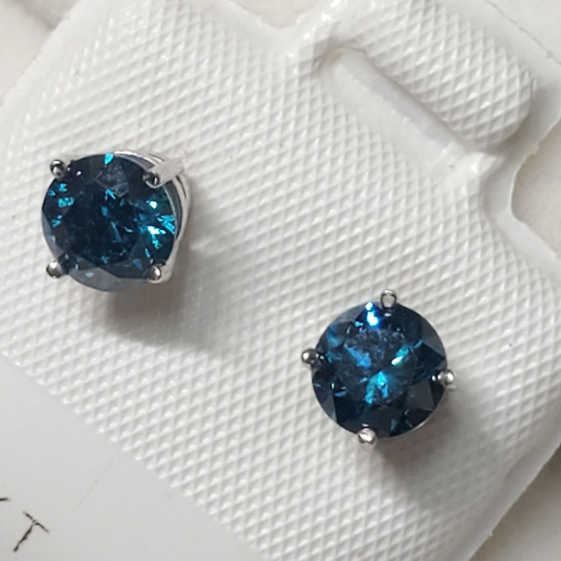 14 KARAT WHITE GOLD PAIR OF FANCY COLOURED BLUE DIAMOND EAR STUDS. BRIGHT POLISHED FOUR PRONG SETTINGS WITH STRAIGHT POSTS SECURE, TWO ROUND BRILLIANT CUT FANCY COLOURED BLUEDIAMONDS, LABORATORY COLOUR ENHANCED. MEASUREMENTS 5.05 5.20 MM. CLARITY GRADE I-2. CUT GRADE GOOD. CARAT WEIGHT TOTAL 1.10 CARATS.TOTAL WEIGHT 0.80 GRAM. COMES WITH CERTIFICATE OF APPRAISAL FROM LOCAL APPRAISER, SUGGESTED INSURANCE COVERAGE $2500.00. JEWELLERY