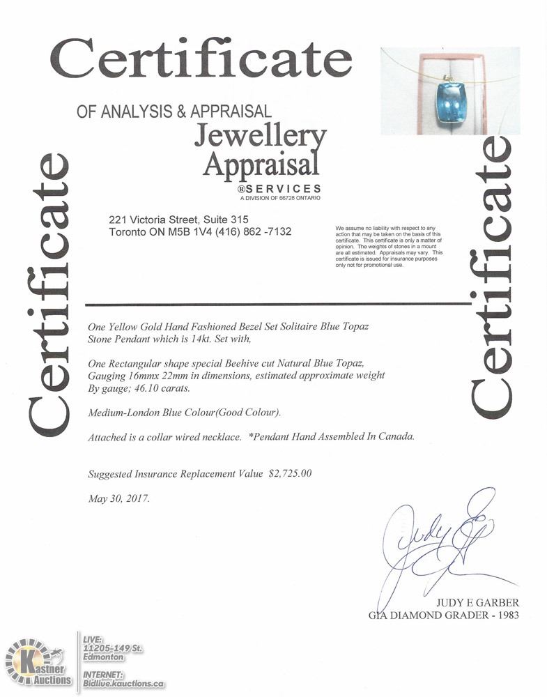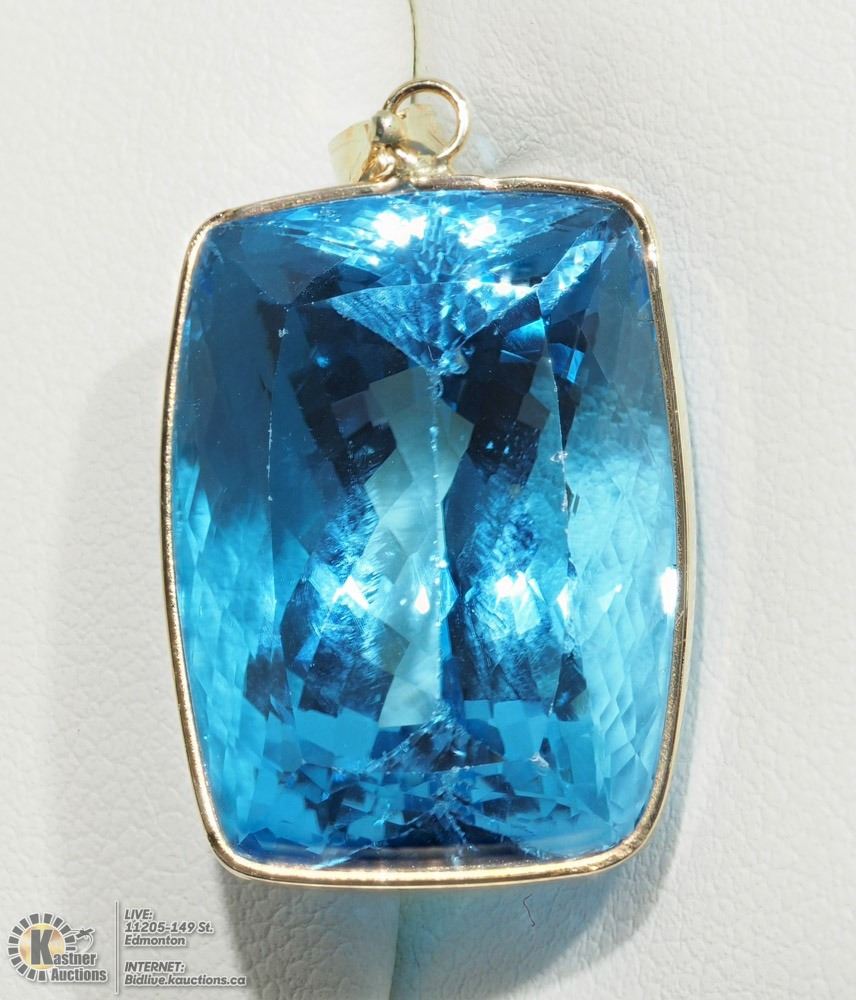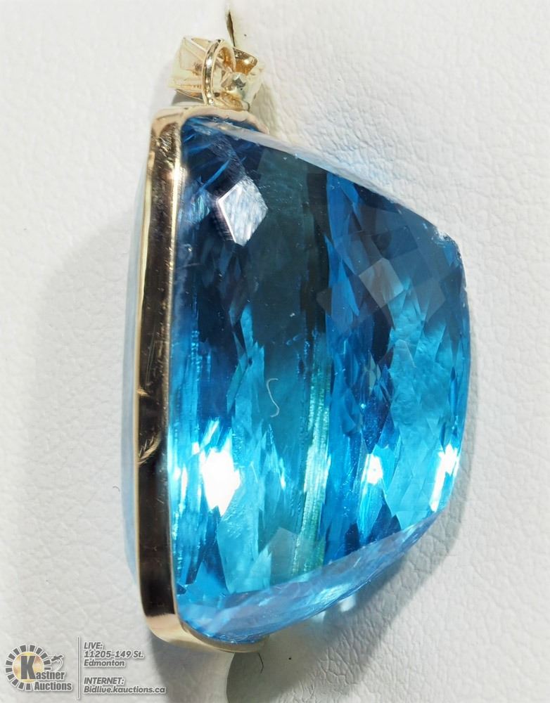 21 - MM86 - 14KT YELLOW GOLD BLUE TOPAZ BEZEL SET SOLITAIRE PENDANT NECKLACE W/COA. SUGGESTED REPLACEMENT VALUE $2725.00. JEWELLERY