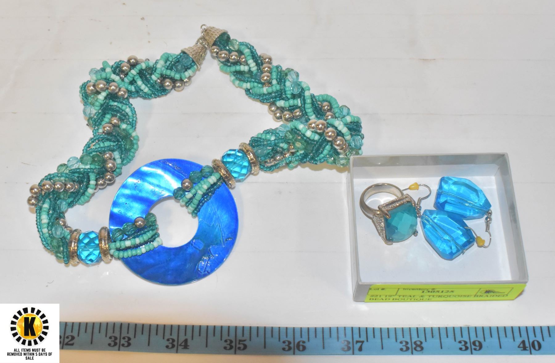 NECKLACE W/ SILVER TONE HARDWARE FEATURING LARGE SEA BLUE GLASS CIRCULAR PIECE. C/W MATCHING STATEMENT RING & DROP EARRINGS