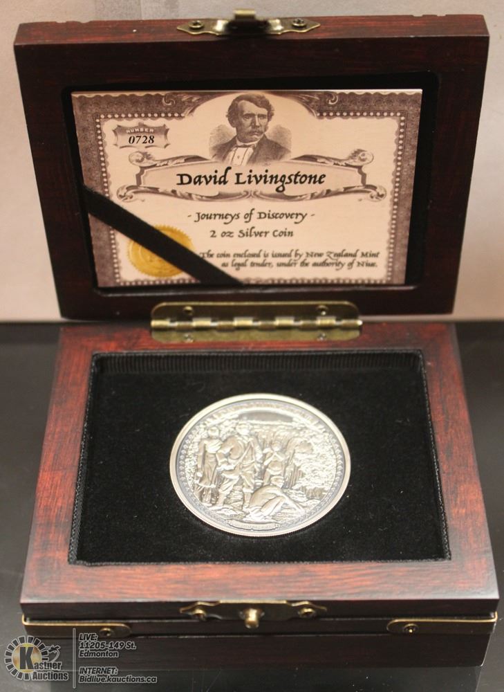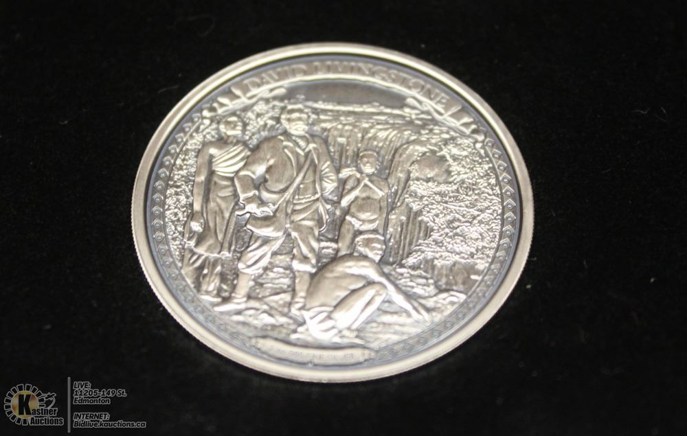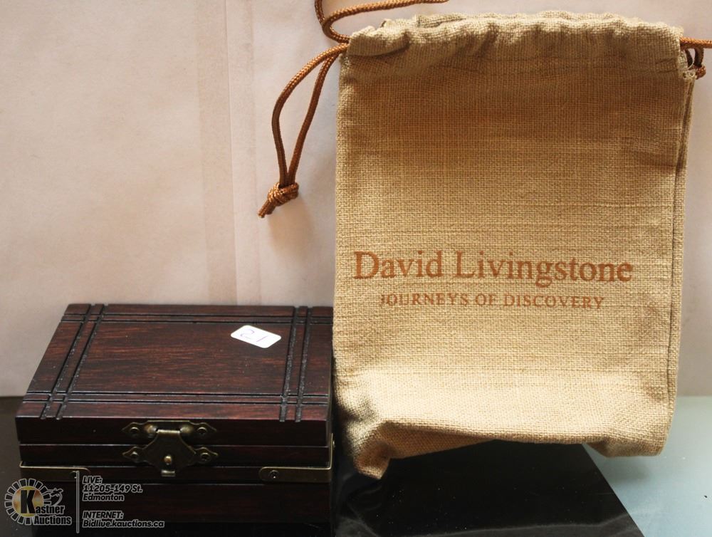 JOURNEYS OF DISCOVERY - DAVID LIVINGSTONE - COMES IN A TREASURE CHEST WITHIN A TREASURE BAG WITH THE COA, THIS RELIEF ENGRAVED COIN SHOWS AN ARTIST'S IMPRESSION OF DAVID LIVINGSTONE STANDING WITH HIS FELLOW EXPLORERS, IN FRONT OF THE BREATH-TAKINGVICTORIA FALLS.