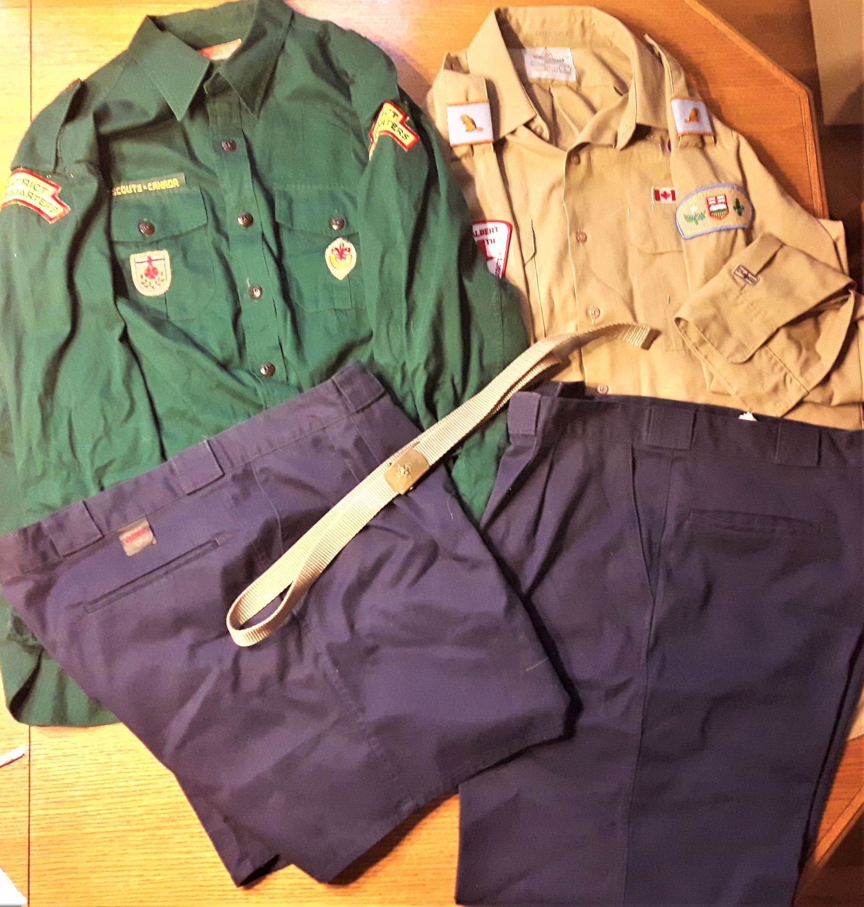 VINTAGE APPAREL INCLUDING 2 LONG SLEEVED SHIRTS, SZ L & SZ 17, 1 PR OF LONG PANTS SZ 38, & 1 PR OF SHORTS SZ 38 & 1 WEBB BELT WITH SCOUTS LOGO. COLLECTIBLES