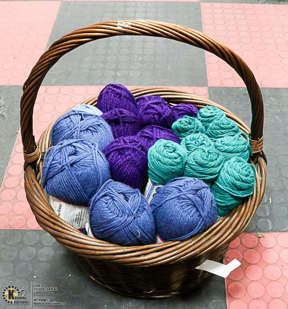 21 NEW ROLLS OF YARN IN EXTRA LARGE WICKER BASKET
