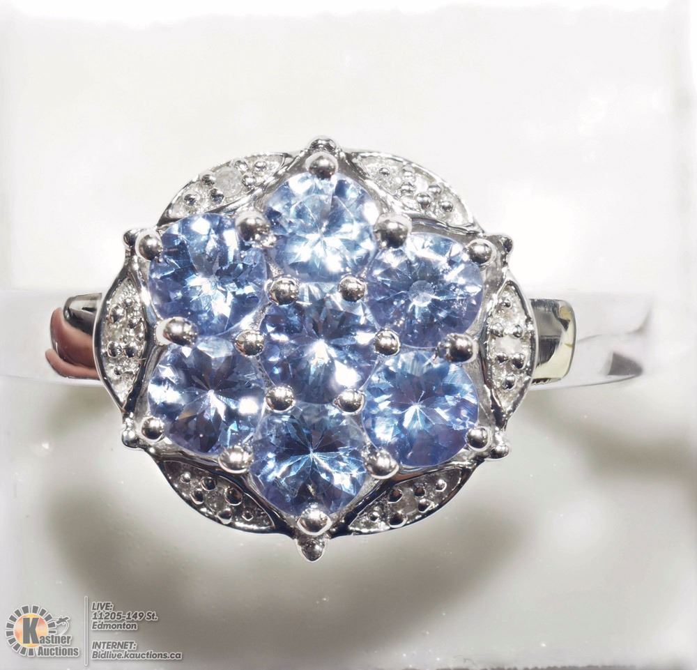 21 - MM51- STERLING SILVER TANZANITE (2.20CT) AND 6 DIAMOND CLUSTER RING SIZE 10, W/ COA. SUGGESTED REPLACEMENT VALUE $795.00. JEWELLERY.