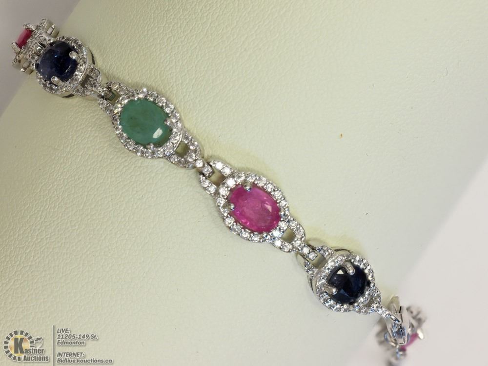 STERLING SILVER EMERALD, RUBY, SAPPHIRE (5.20CT TOTAL) ADJUSTABLE BRACELET. W/ COA - SUGGESTED RETAIL VALUE $700.00