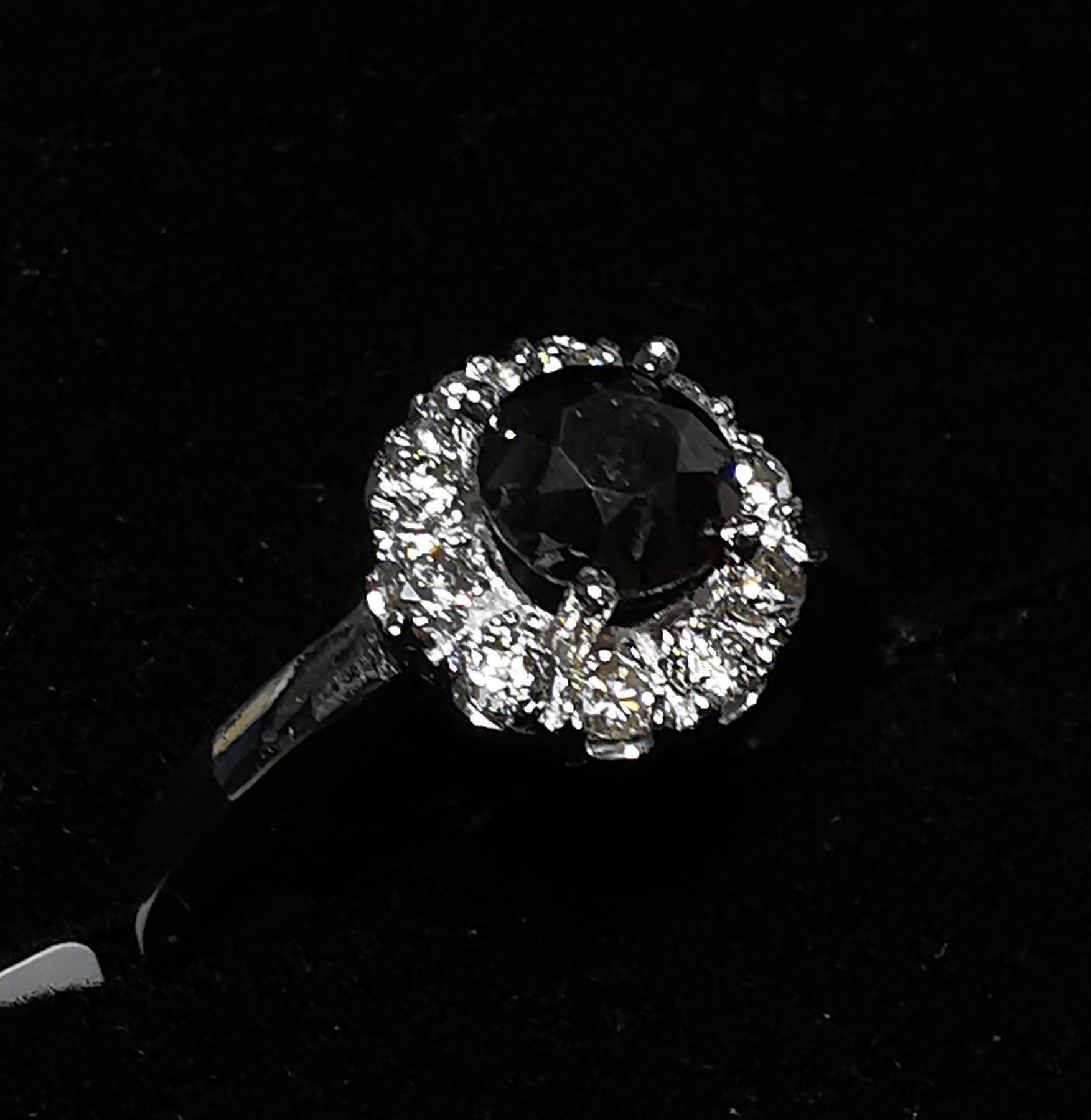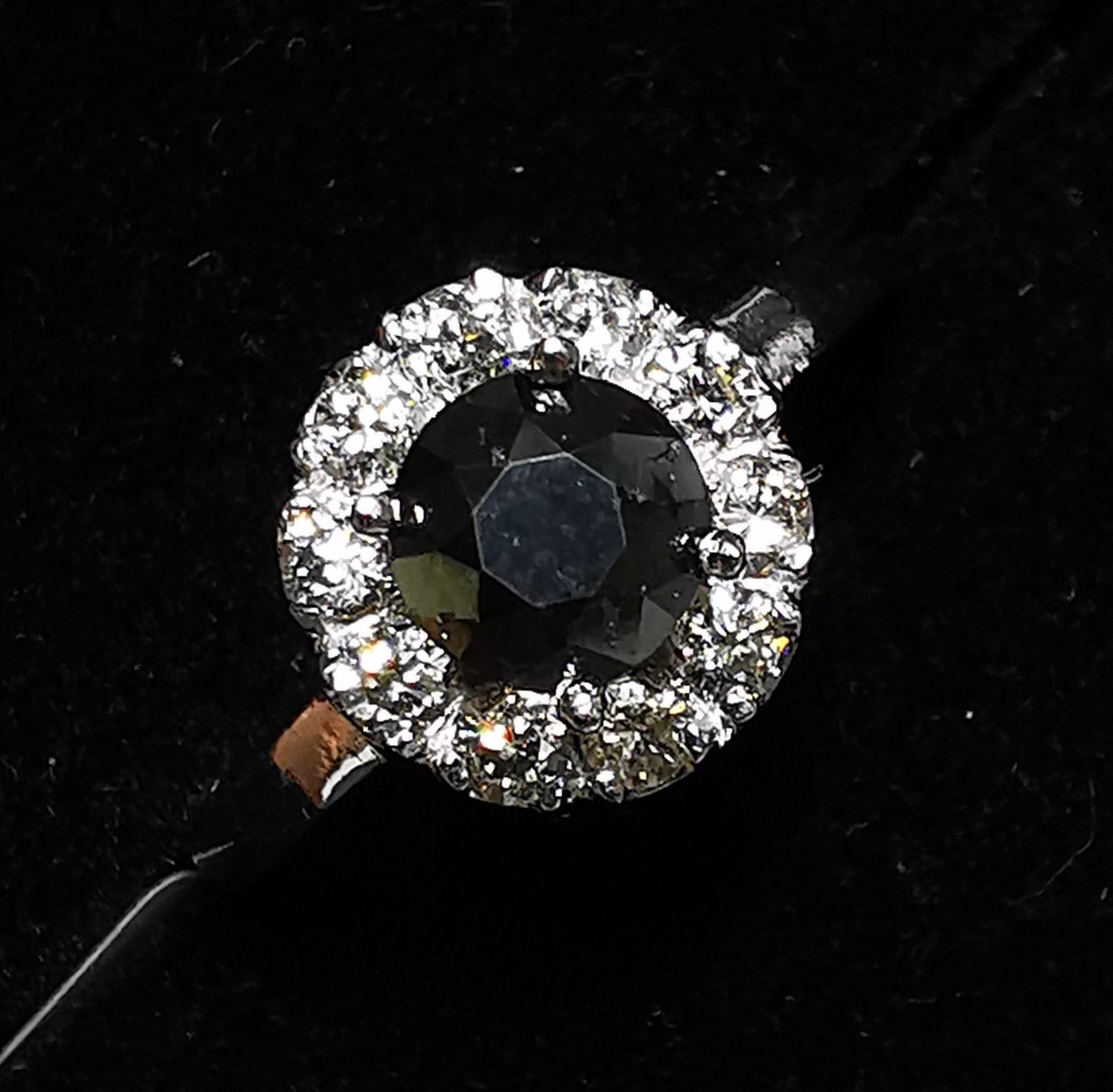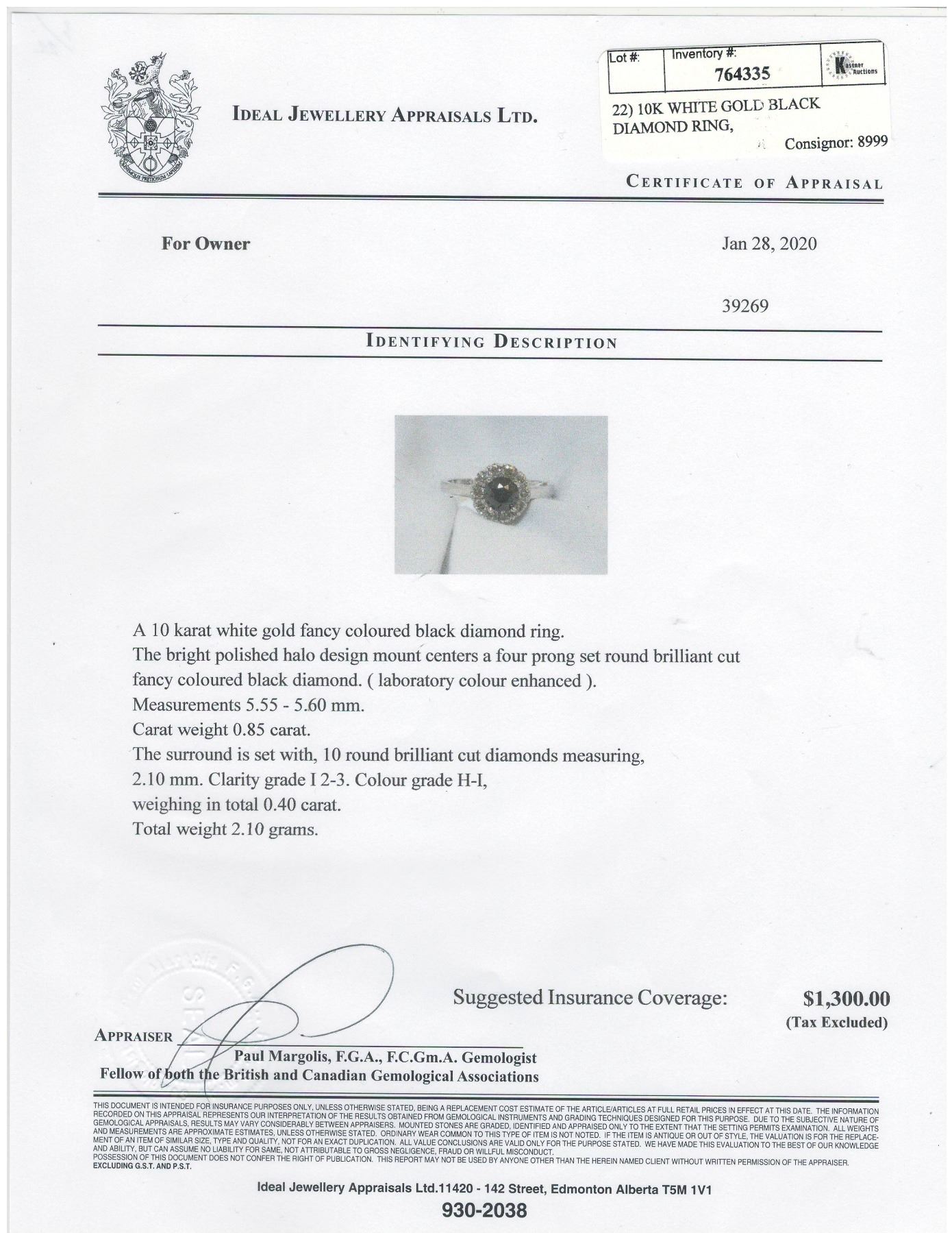 SIZE 6, ONE ROUND BRILLIANT CUT FANCY COLORED BLACK DIAMOND (LAB COLOR ENHANCED, MEASURING 5.55 - 5.60 MM, WEIGHING 0.85 CARATS), 10 ROUND BRILLIANT CUT DIAMONDS (MEASURING 2.10 MM, CLARITY GRADE I 2-3, COLOR GRADE H-I, WEIGHING 0.40 CARATS). COMES WITH CERTIFICATE OF APPRAISAL FROM LOCAL APPRAISER, SUGGESTED INSURANCE COVERAGE $1,300.00. JEWELLERY