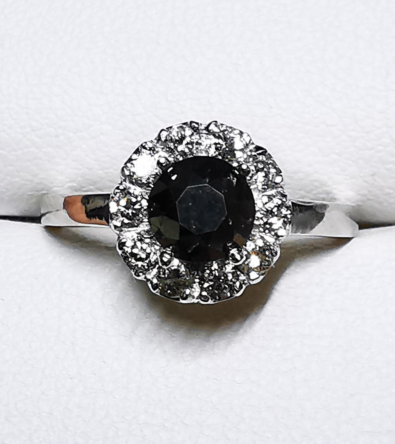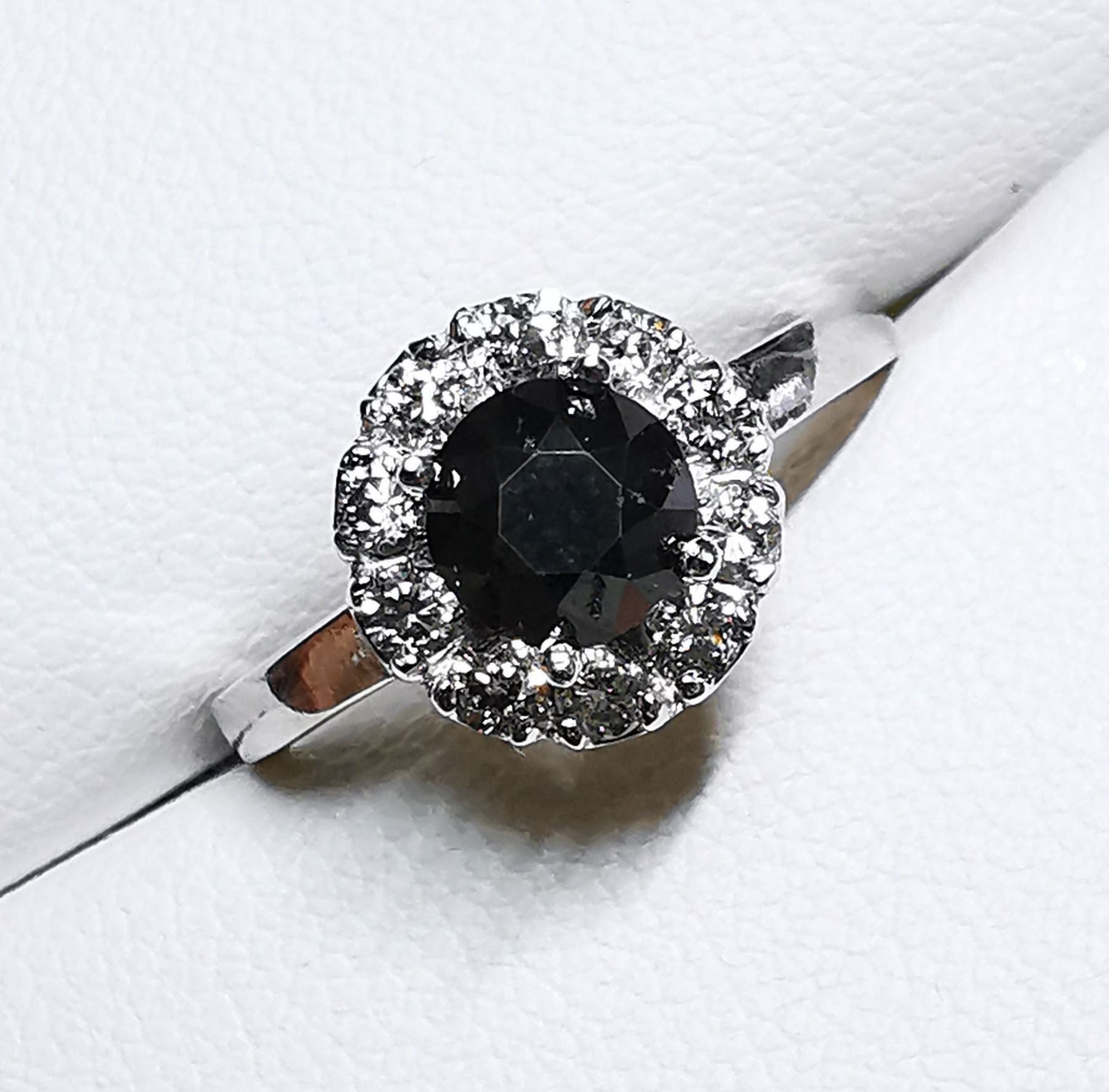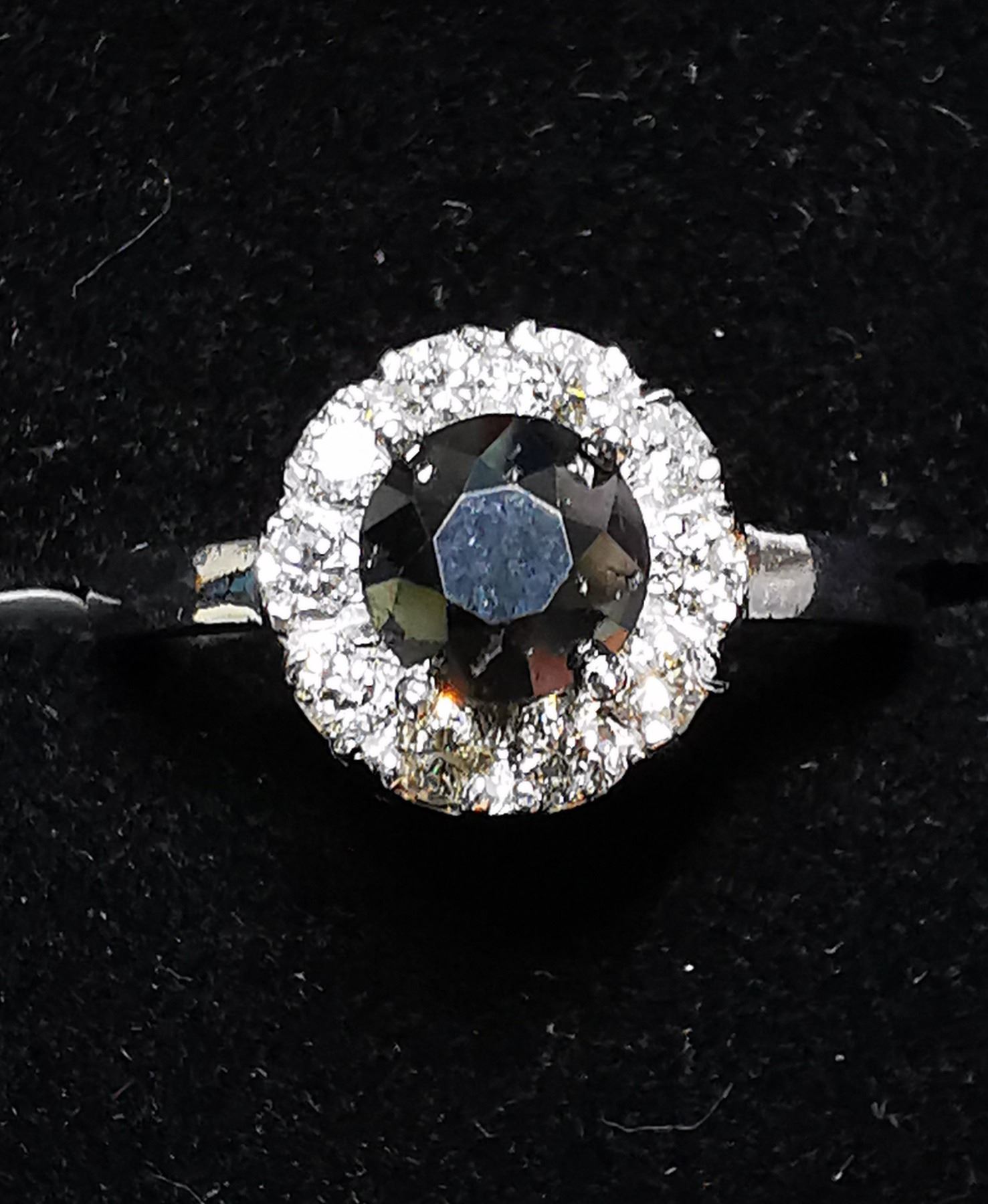 SIZE 6, ONE ROUND BRILLIANT CUT FANCY COLORED BLACK DIAMOND (LAB COLOR ENHANCED, MEASURING 5.55 - 5.60 MM, WEIGHING 0.85 CARATS), 10 ROUND BRILLIANT CUT DIAMONDS (MEASURING 2.10 MM, CLARITY GRADE I 2-3, COLOR GRADE H-I, WEIGHING 0.40 CARATS). COMES WITH CERTIFICATE OF APPRAISAL FROM LOCAL APPRAISER, SUGGESTED INSURANCE COVERAGE $1,300.00. JEWELLERY