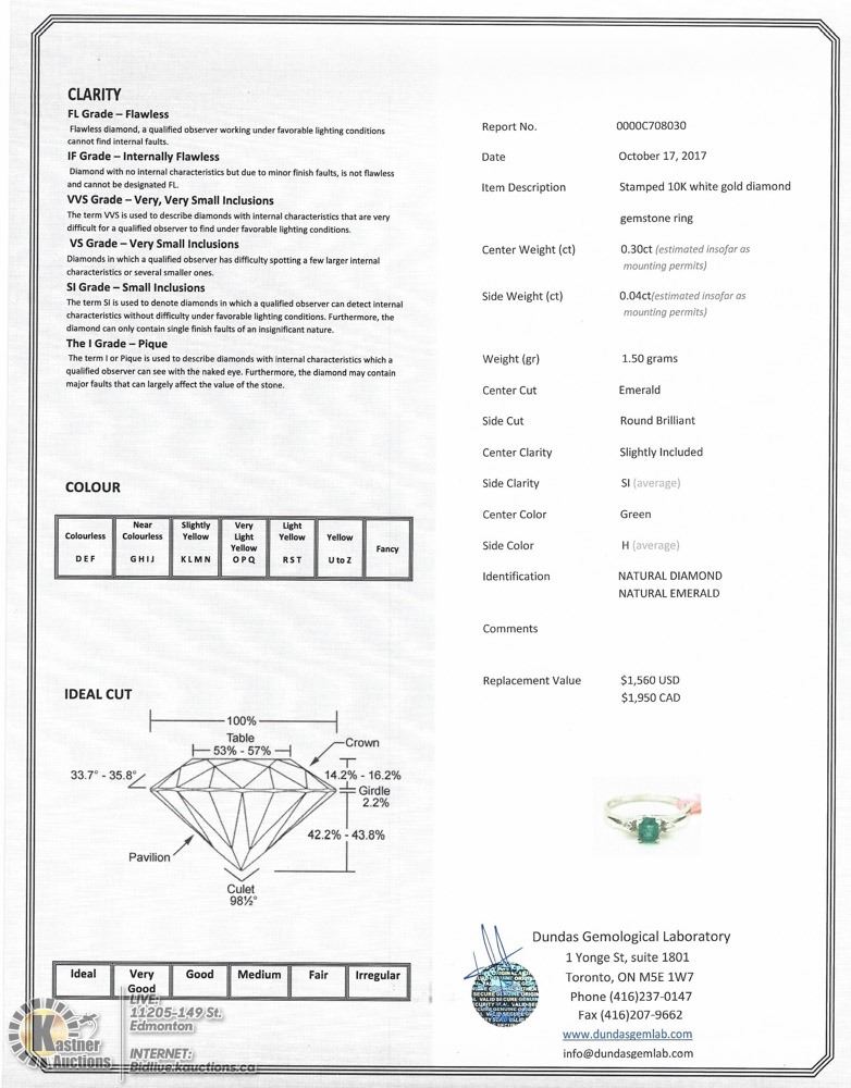22 - MM86 - 10KT WHITE GOLD EMERALD DIAMOND RING SIZE 5.25 W/COA. SUGGESTED REPLACEMENT VALUE $1950.00. JEWELLERY