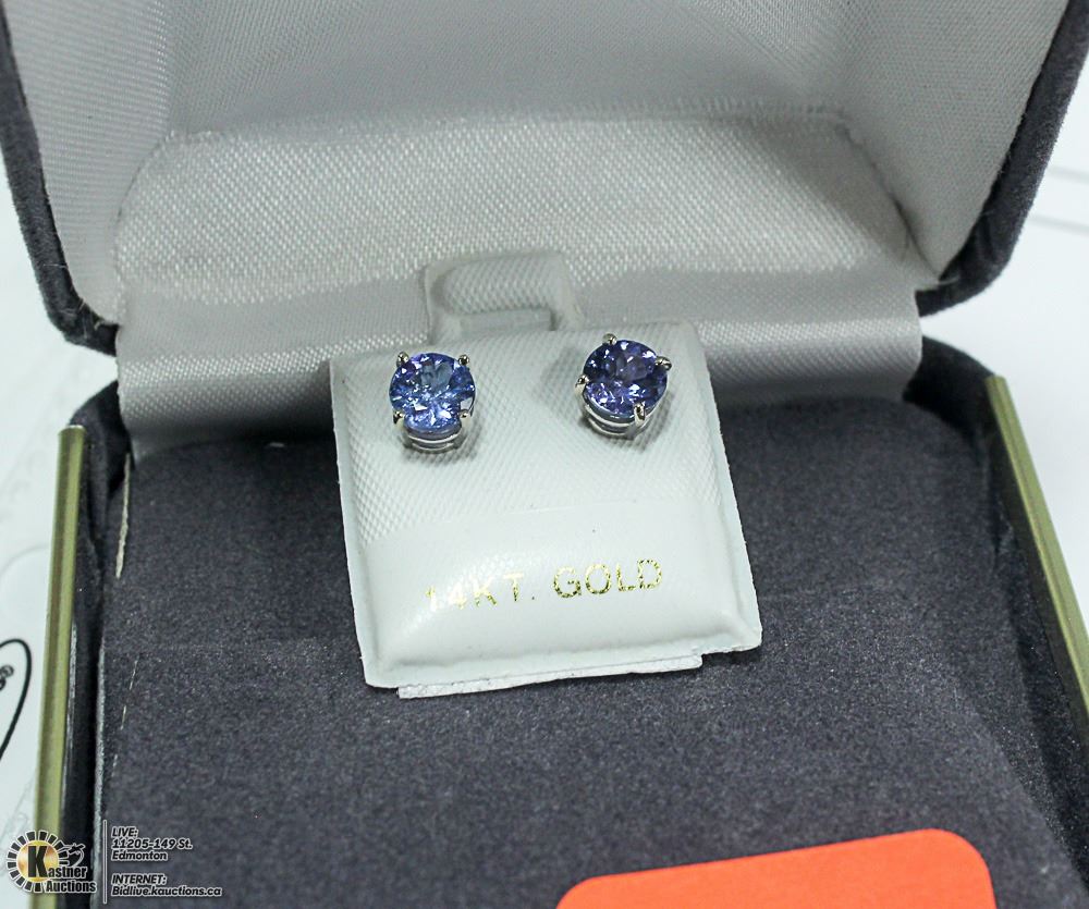 A 14 KARAT WHITE GOLD PAIR OF SINGLE STONE TANZANITE CAR STUDS. THE BRIGHT POLISHED FOUR PRONG SETTINGS WITH STRAIGHT POSTS SECURE, TWO ROUND CUT NATURAL TANZANITE’S MEASURING.5.35-5.40 X MM. TONE MEDIUM LIGHT, HUE VIOLET BLUE, CLARITY GRADE I 1-2. THE TANZANITE’S WEIGH IN TOTAL 1.50 CARATS. TOTAL WEIGHT 1.00 GRAM..CERTIFICATE OF APPRAISAL FROM LOCAL APPRAISER, SUGGESTED INSURANCE COVERAGE $1000.00.