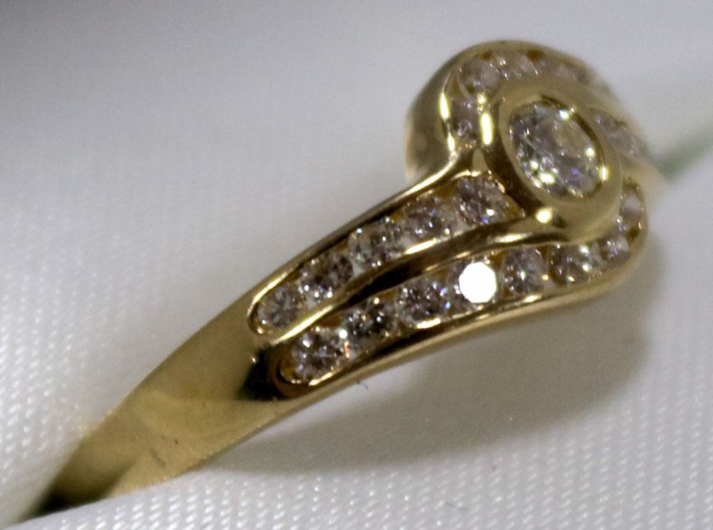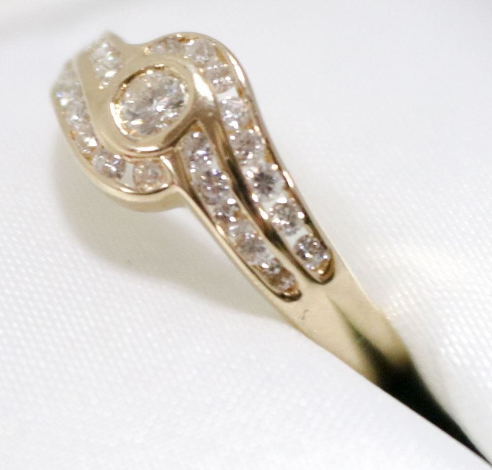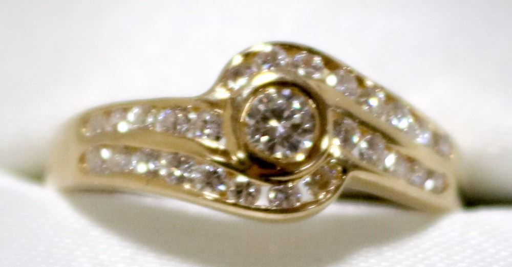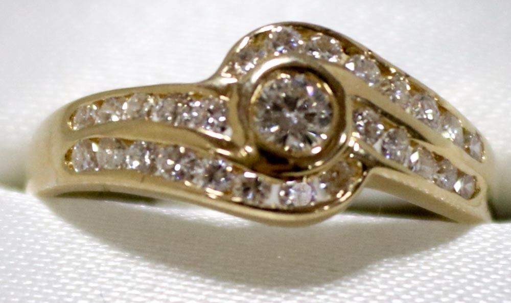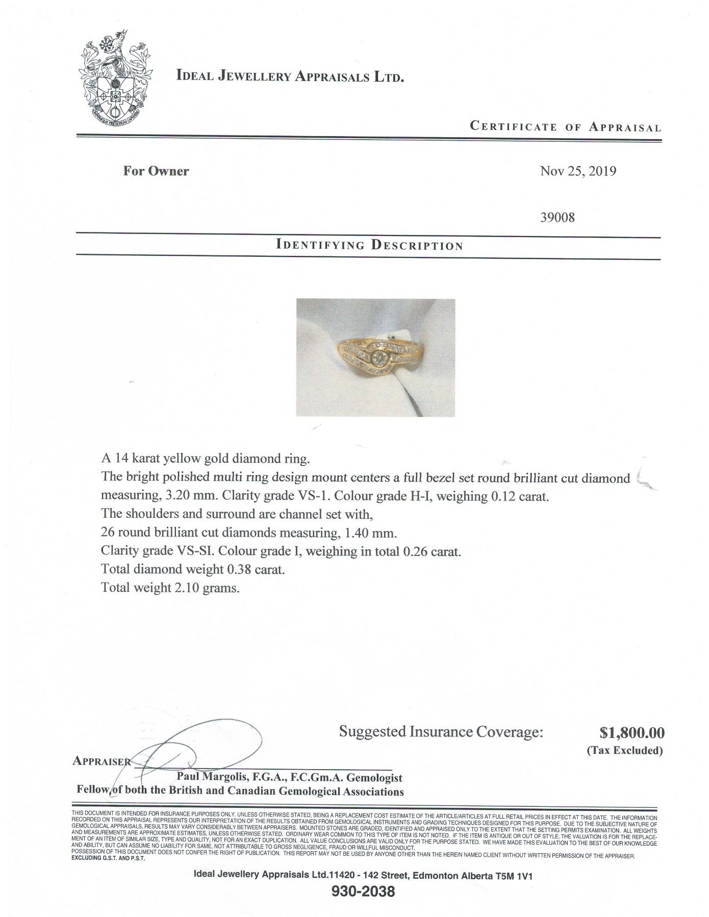 SIZE 5.75 WITH LOCAL APPRAISAL, ONE ROUND BRILLIANT CUT DIAMOND, CLARITY GRADE VS-1, COLOR GRADE H-I, CARAT WEIGHT 0.12 CARATS, 26 ROUND BRILLIANT CUT DIAMONDS, CLARITY GRADE VS-SI, COLOR GRADE I, CARAT WEIGHT 0.26 CARATS, TOTAL DIAMONDWEIGHT 0.38 CARATS, TOTAL WEIGHT 2.10 GRAMS. SUGGESTED INSURANCE COVERAGE $1,800.00. JEWELLERY